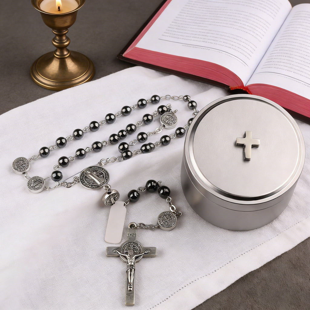 For the believer who carries faith with quiet strength—this black onyx rosary isn’t just a prayer tool. It’s a striking blend of sacred symbolism and modern durability: polished black onyx beads (steeped in spiritual tradition) paired with alloy silver-plated accents, all housed in a cross-embossed keepsake tin. Crafted to stand out in your prayer routine and your everyday wardrobe.