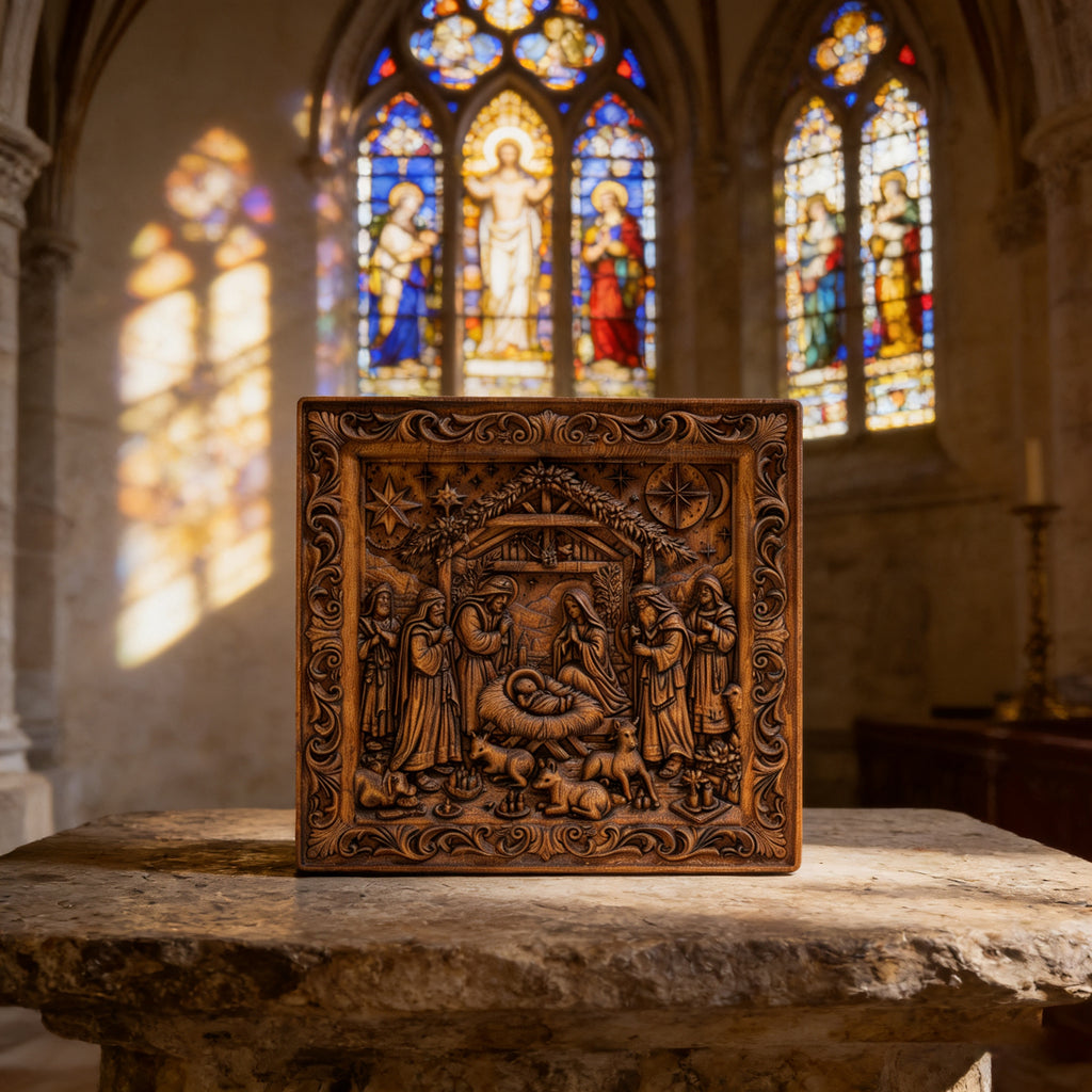 This handcarved beechwood nativity relief isn't "decor." It's the heart of Christmas, tucked into the corners of your life: a tangible way to remember that God entered our world in the most humble way imaginable.