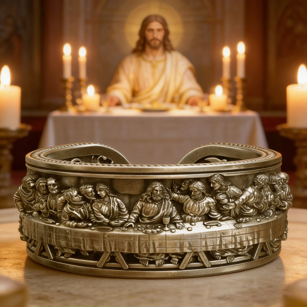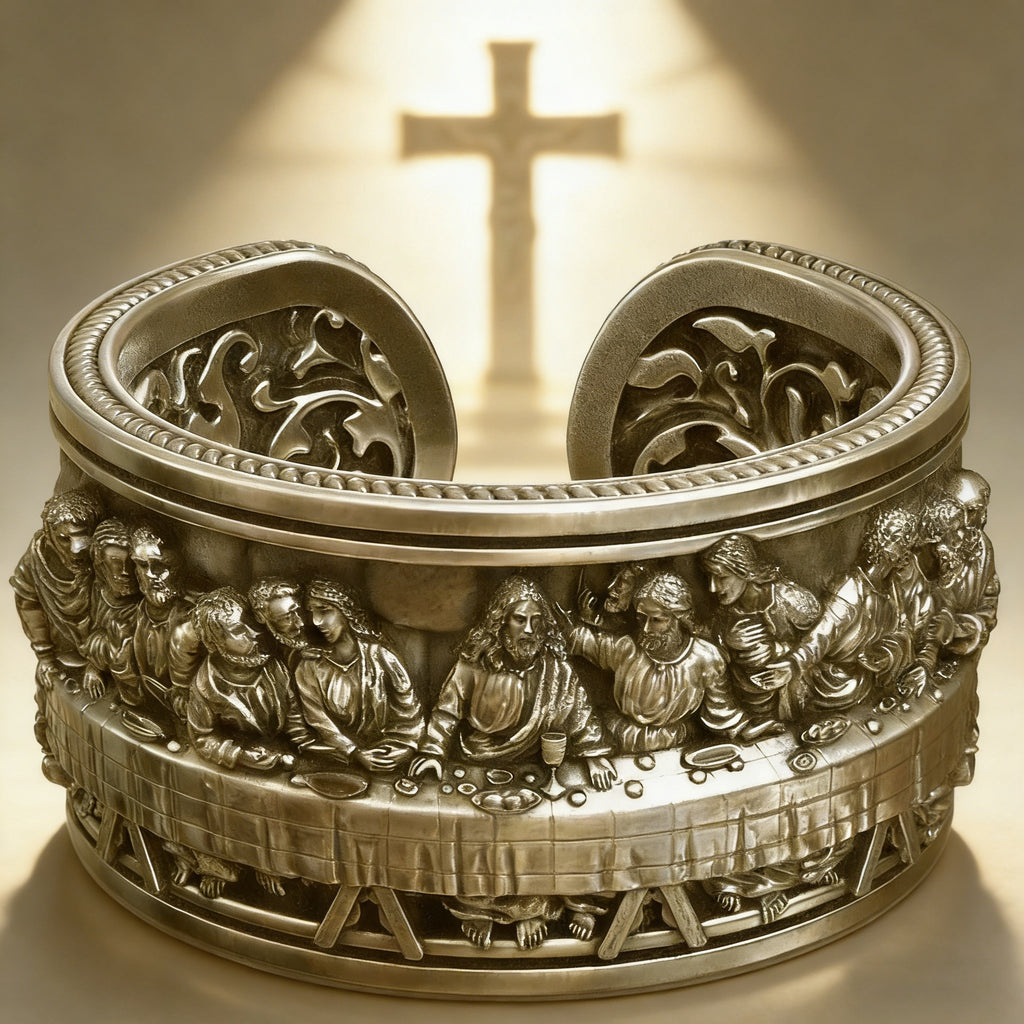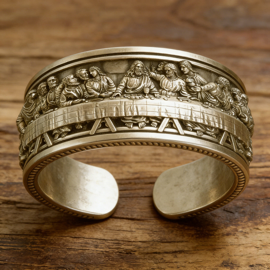 The surface of the bracelet is engraved with the famous "Last Supper" scene from John 13:21: "And he stretched out his hand, and took bread, and gave thanks to God before all the people: and he brake the bread, and gave to every man. This is truly a meaningful bracelet that any devout Catholic, Christian, or Bible scholar would want to wear on their finger.