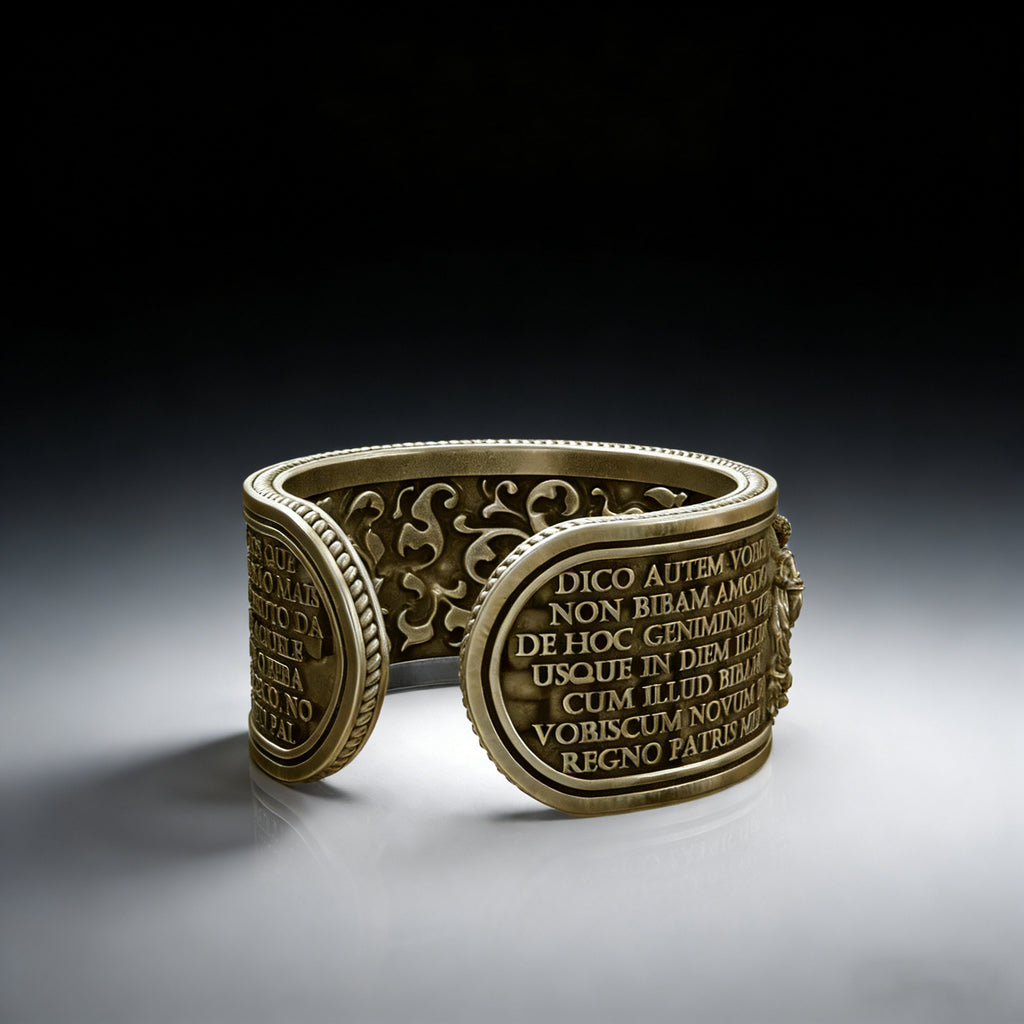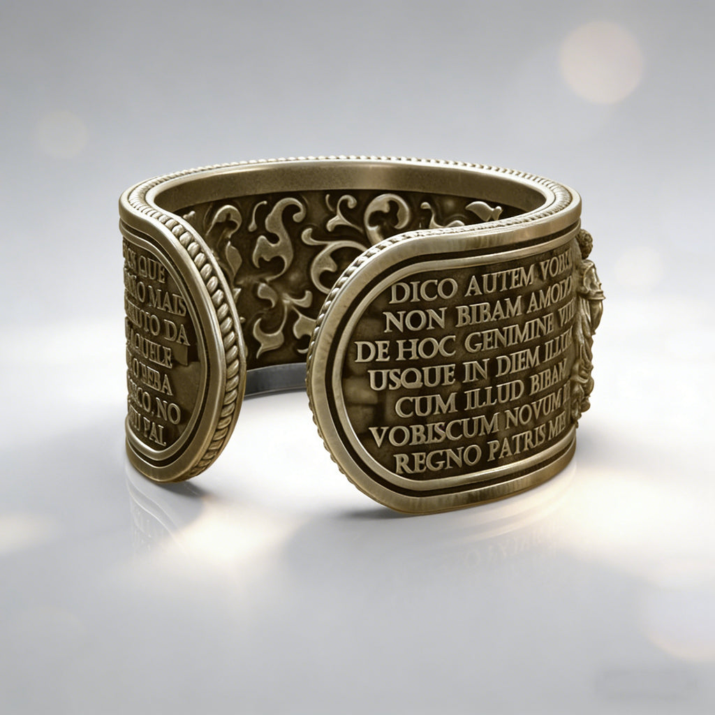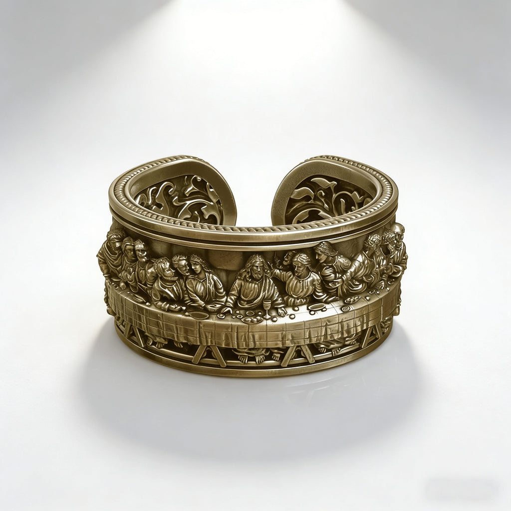 The surface of the bracelet is engraved with the famous "Last Supper" scene from John 13:21: "And he stretched out his hand, and took bread, and gave thanks to God before all the people: and he brake the bread, and gave to every man. This is truly a meaningful bracelet that any devout Catholic, Christian, or Bible scholar would want to wear on their finger.
