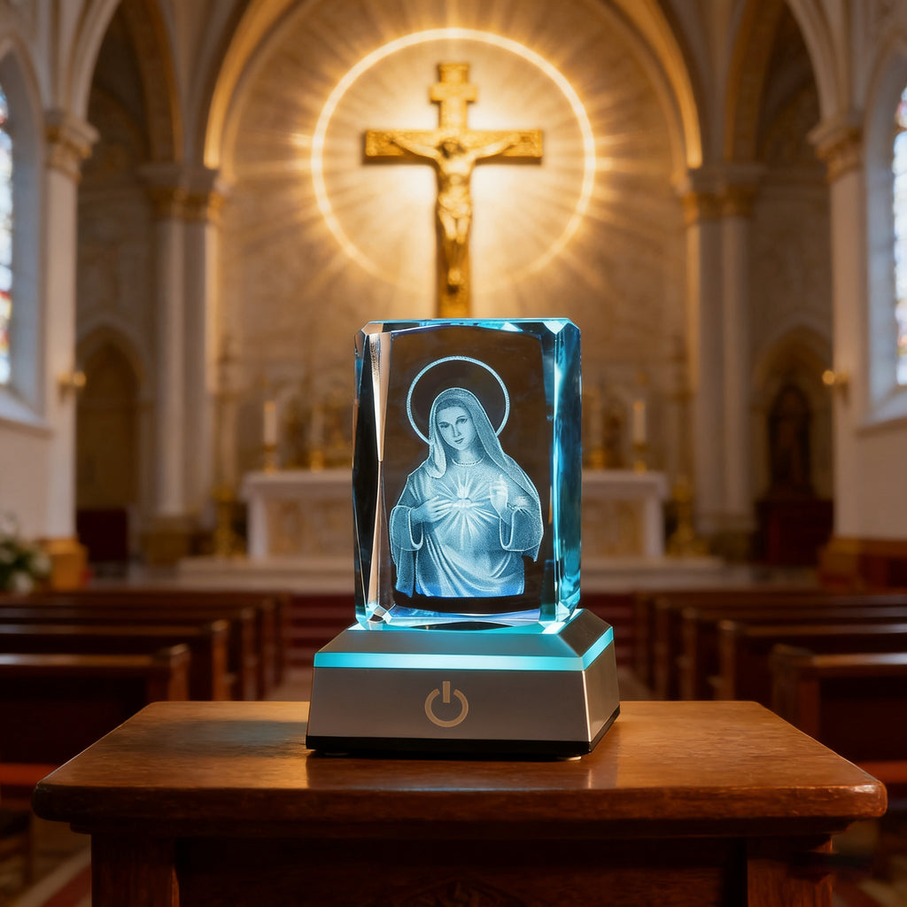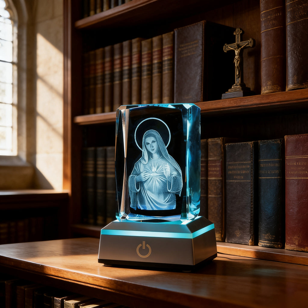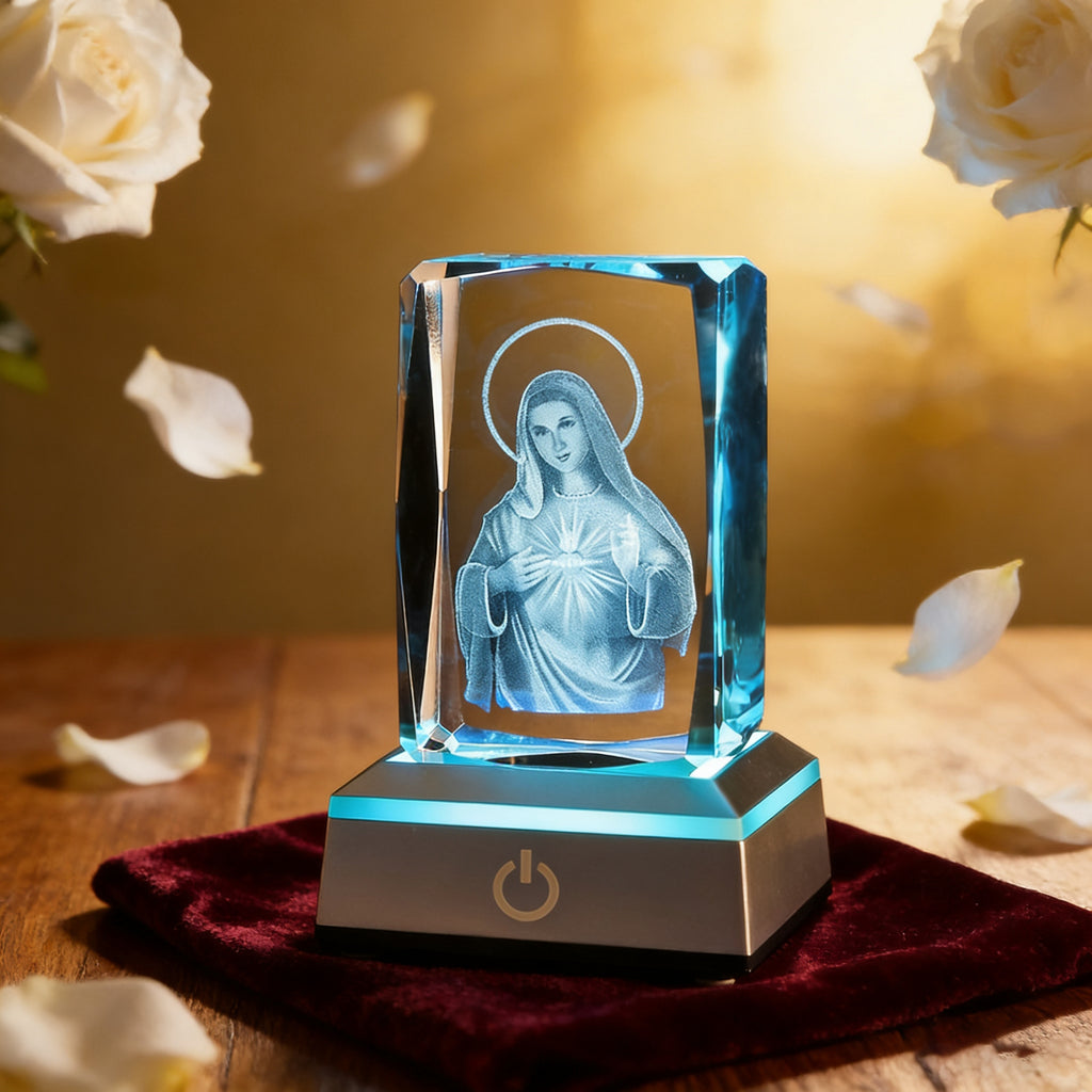 • 3D Inner Carving: The image of Mary (with a halo) and her radiant Immaculate Heart are precisely engraved inside the high-transparency crystal. When the base light turns on, the details glow softly, as if her tenderness is within reach.