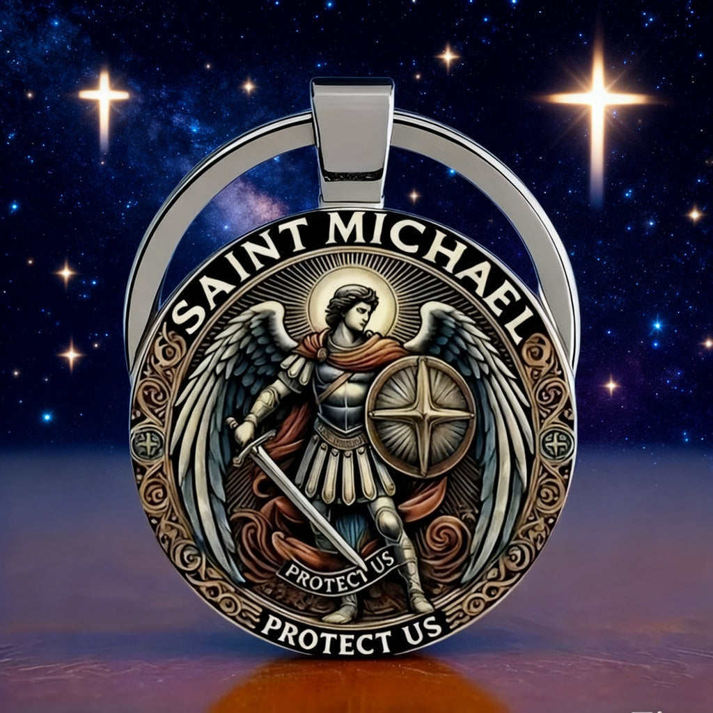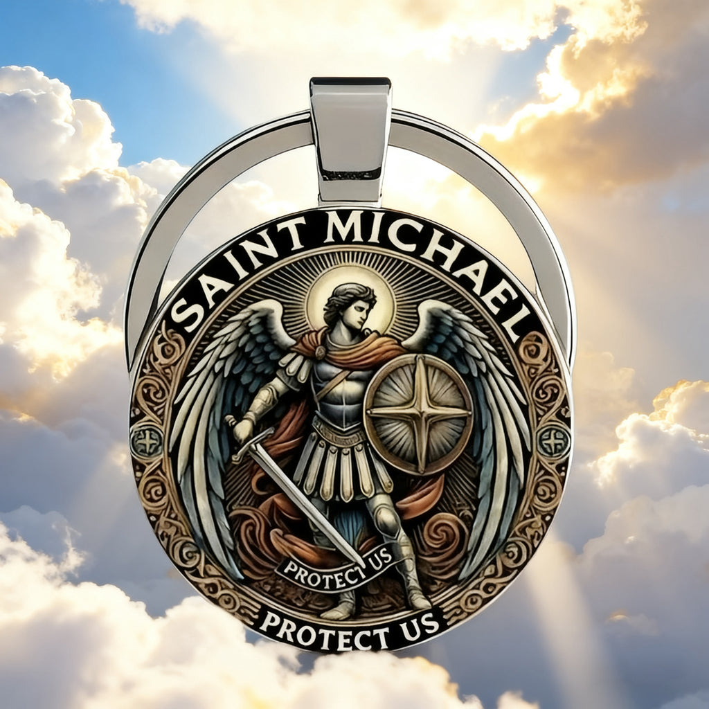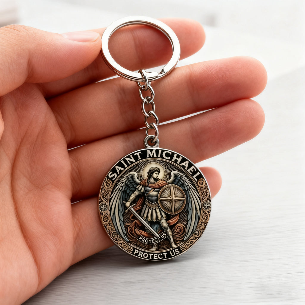 This keychain centers Saint Michael the Archangel—the warrior of God who defeated evil (Revelation 12:7-9) and stands as the patron of those who serve (law enforcement, soldiers, first responders). Every detail is a quiet prayer: