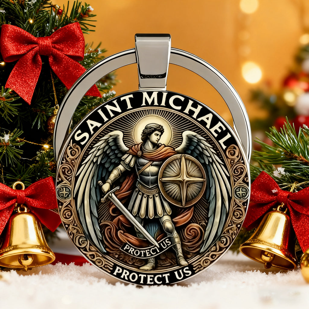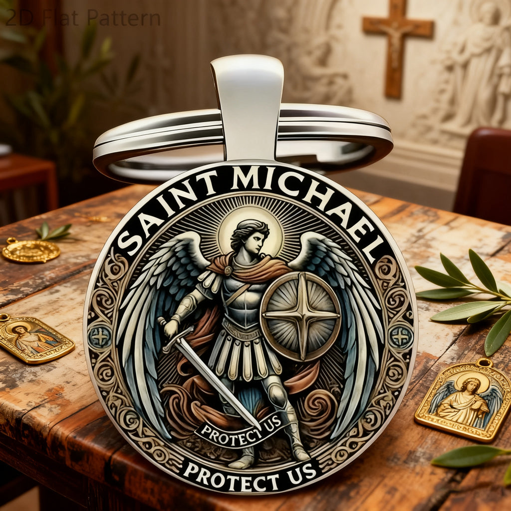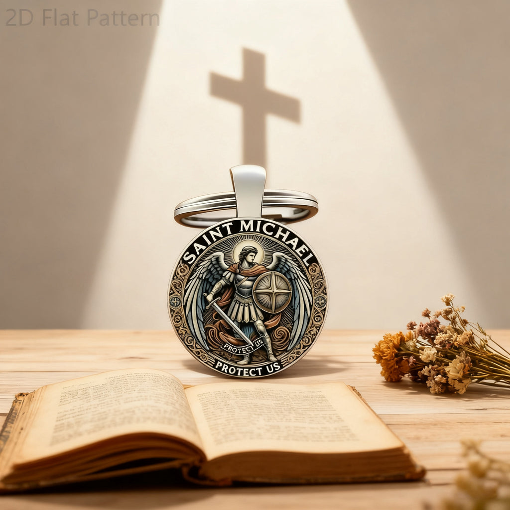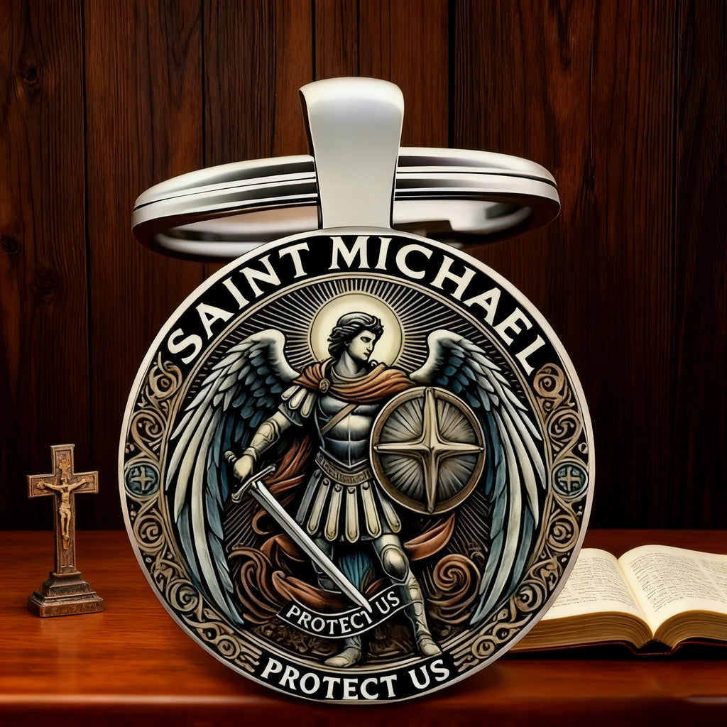 This keychain centers Saint Michael the Archangel—the warrior of God who defeated evil (Revelation 12:7-9) and stands as the patron of those who serve (law enforcement, soldiers, first responders). Every detail is a quiet prayer: