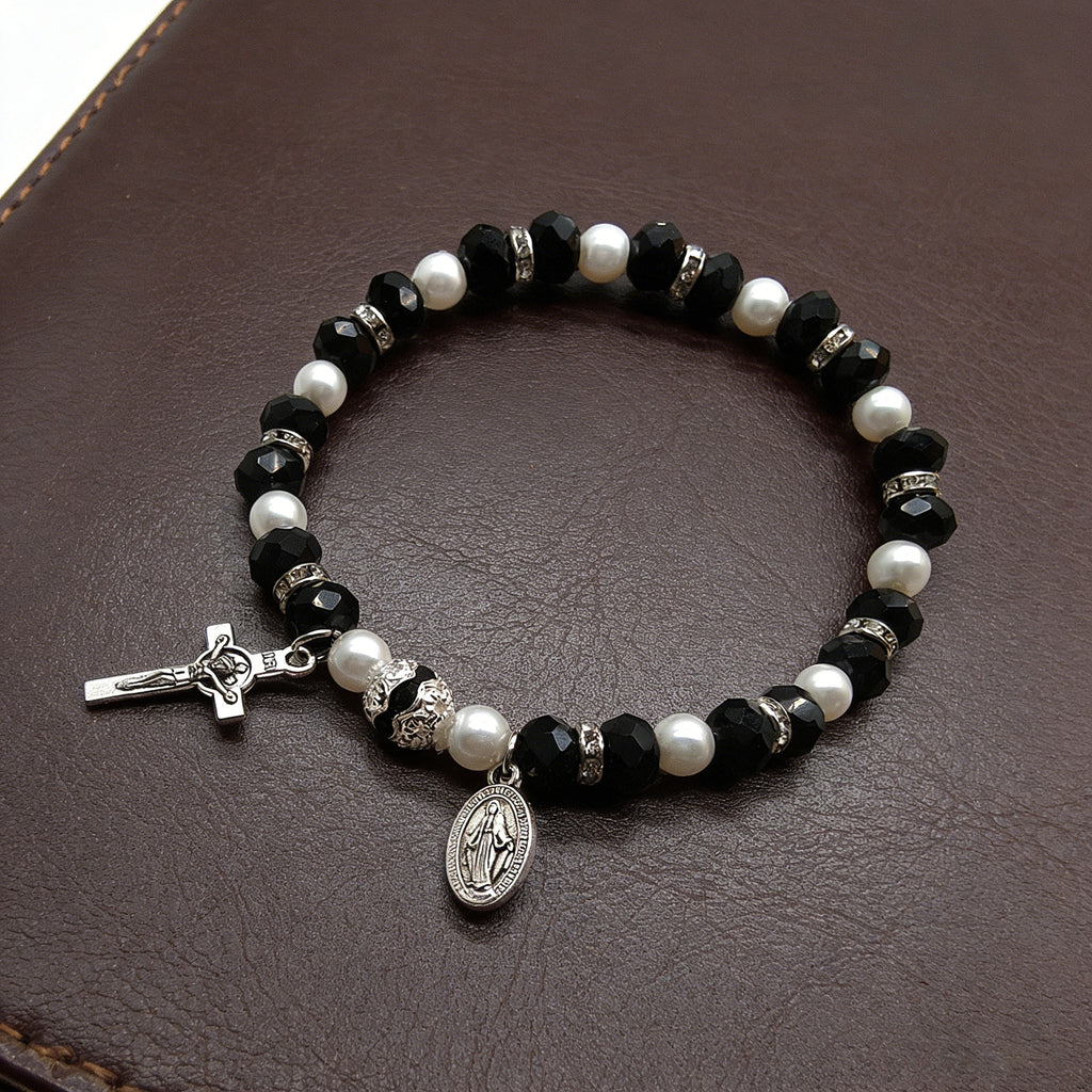 This elegant rosary bracelet combines the sacred tradition of the rosary with the luminous beauty of faceted crystal beads and lustrous pearls. Available in serene sky blue and classic black, it is designed to be worn as a constant reminder of faith, prayer, and the grace of God.✝️💎