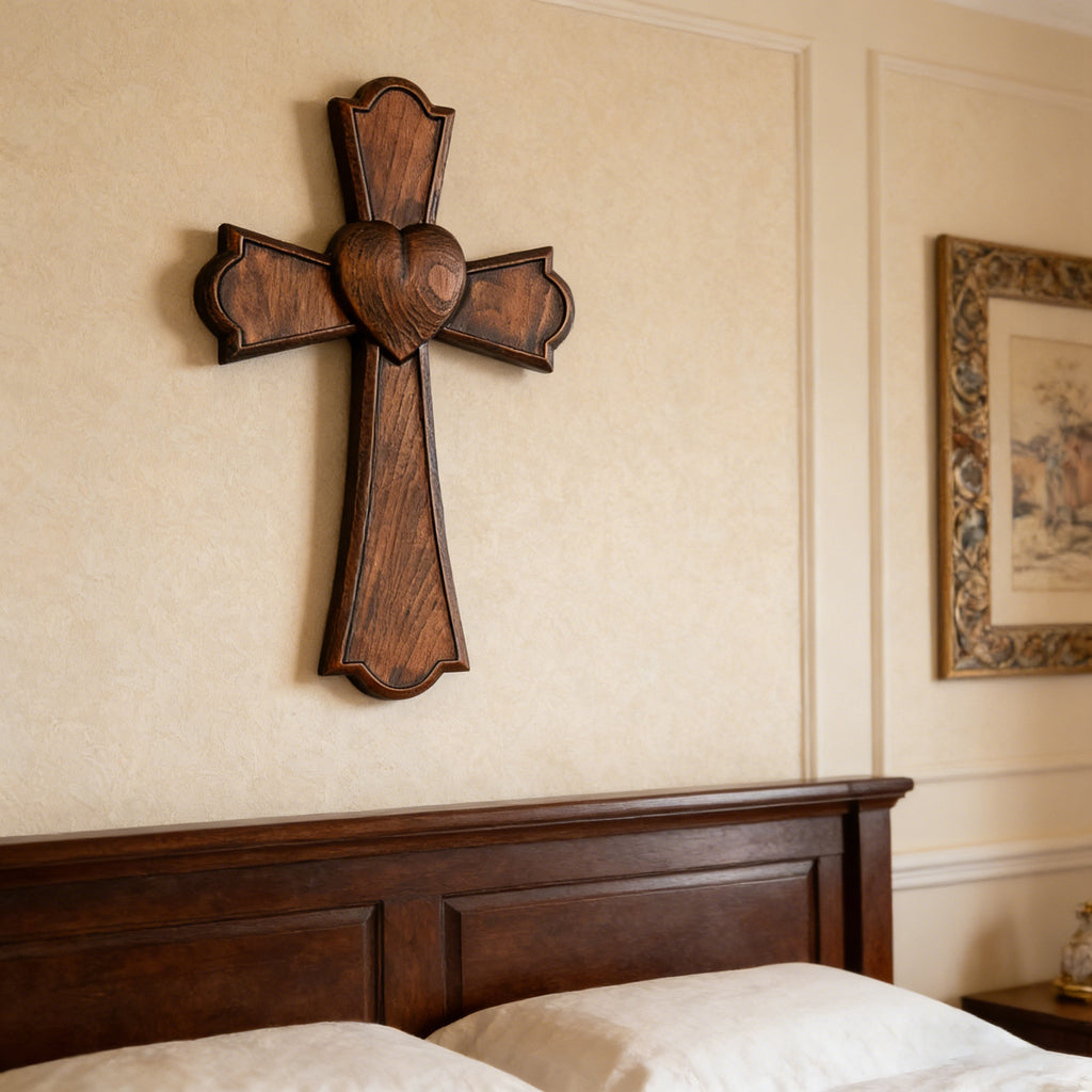 Eternal Heart Hand-Carved Wood Cross: Faith Woven with Love