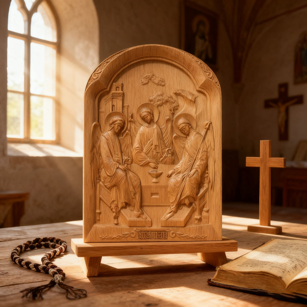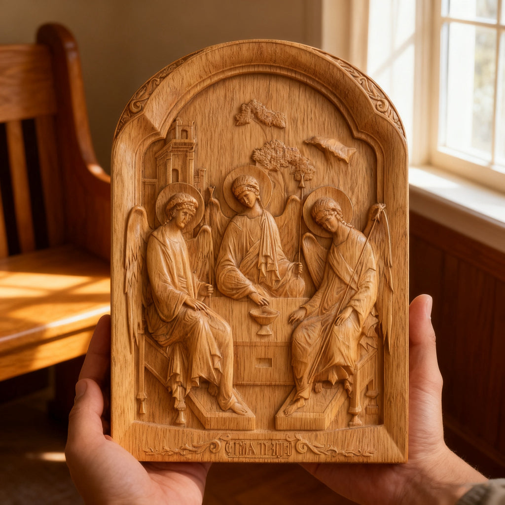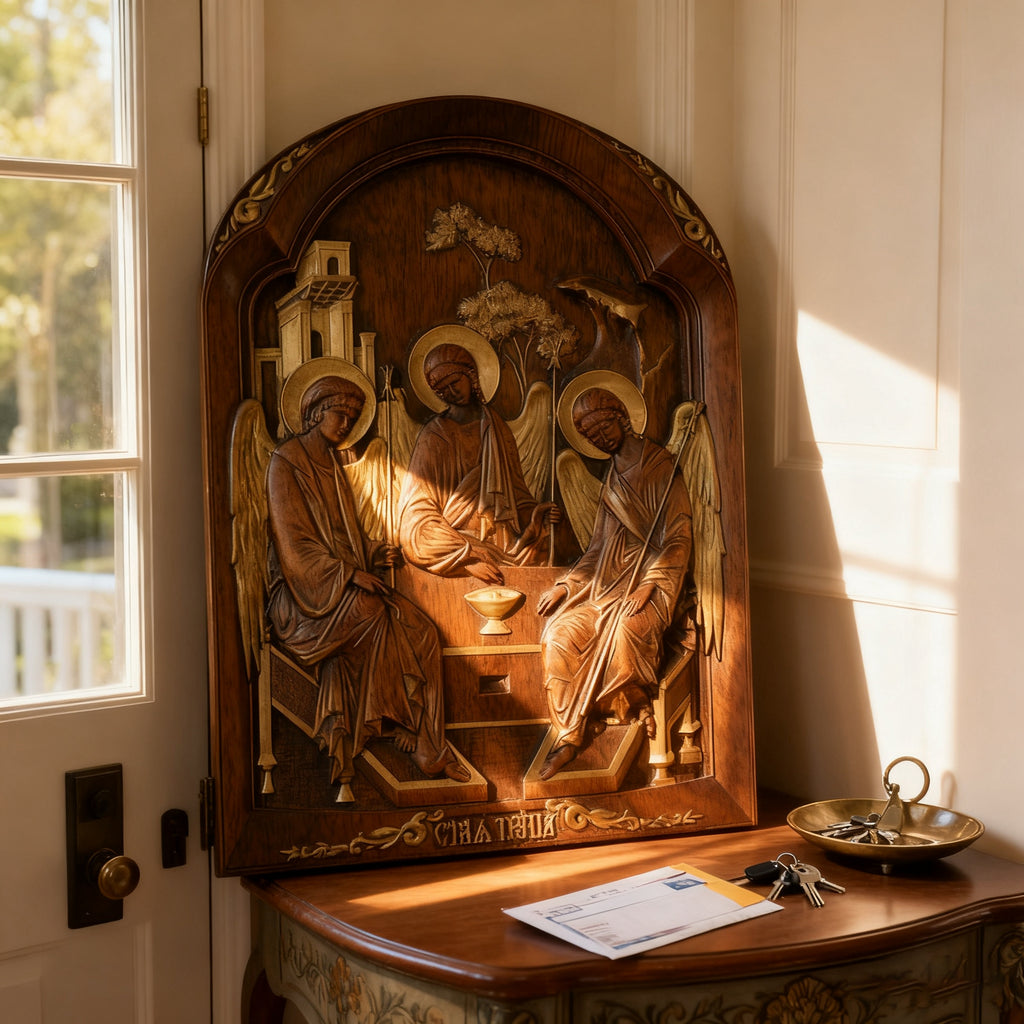 In accordance with the ancient tradition of the Church, this hand-carved icon of the Holy Trinity offers a window into heaven for your home. Faithfully crafted from a single piece of beechwood, it invites you not merely to look, but to see—with the eyes of prayer—the eternal communion of the Father, the Son, and the Holy Spirit.