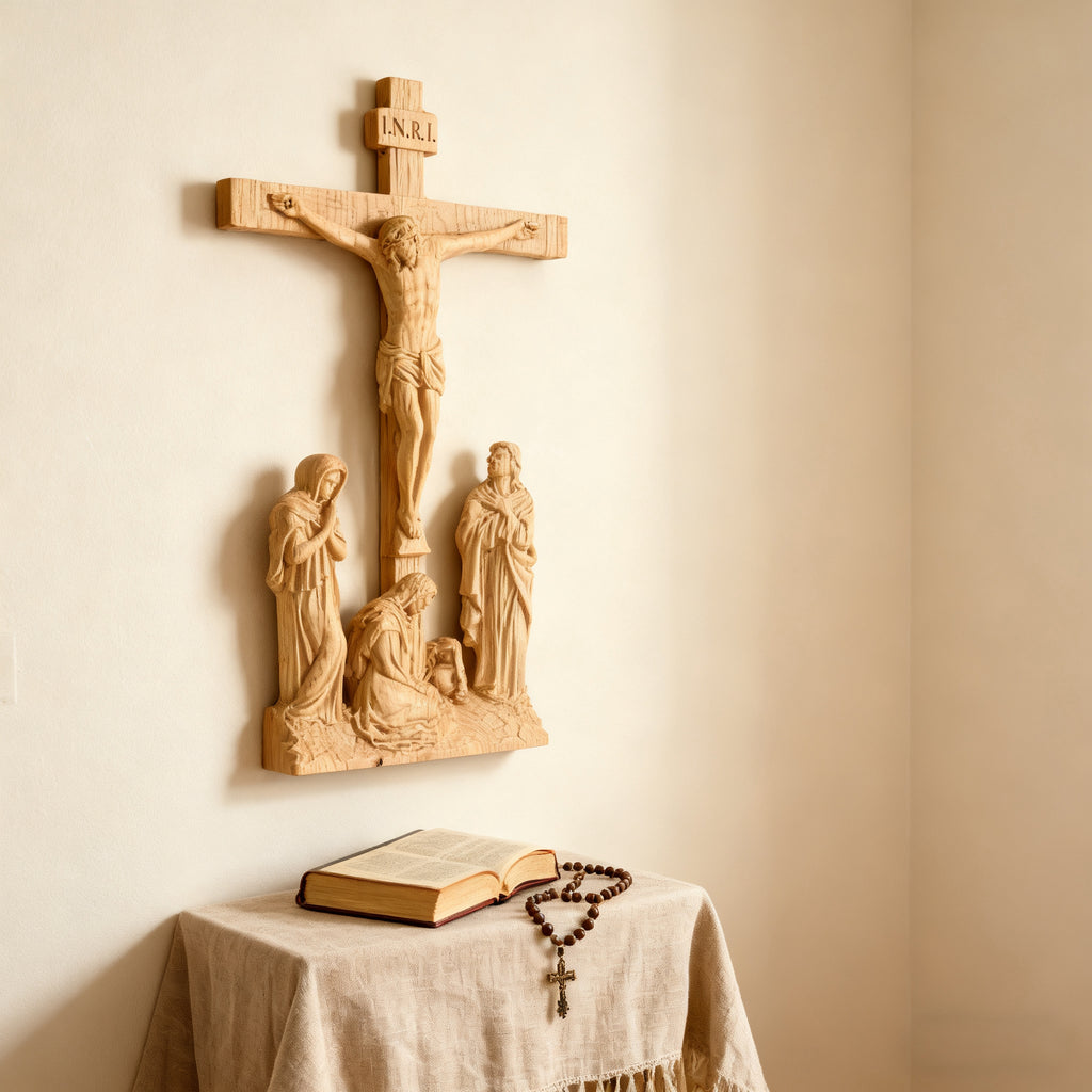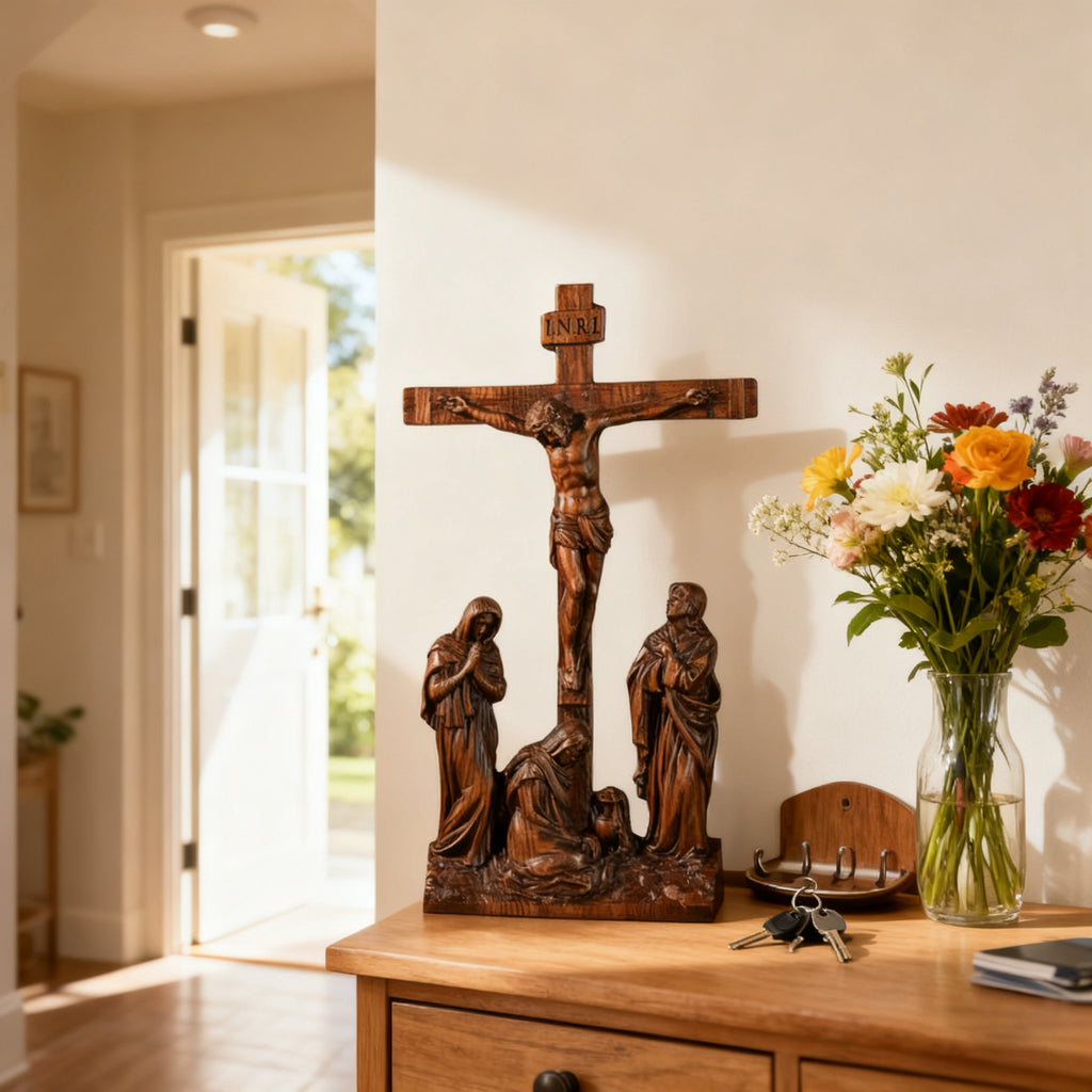 In the tradition of sacred craftsmanship, this Calvary sculpture is prayerfully carved from a single piece of solid ash wood. Each contour is shaped by hands that understand they are handling more than wood—they are giving form to the central story of our faith. The visible grain beneath the gentle, hand-applied finish serves as a constant reminder of the natural world that witnessed His sacrifice and the new creation He made possible.