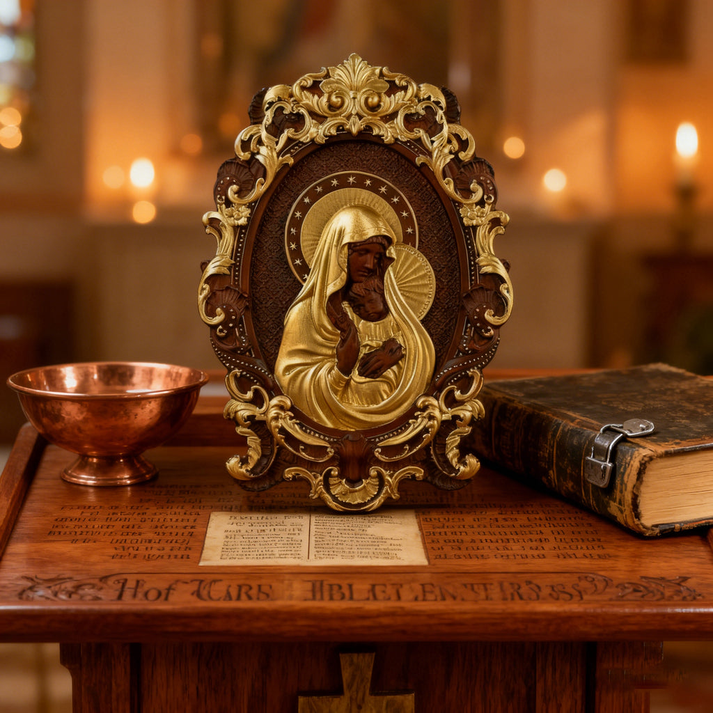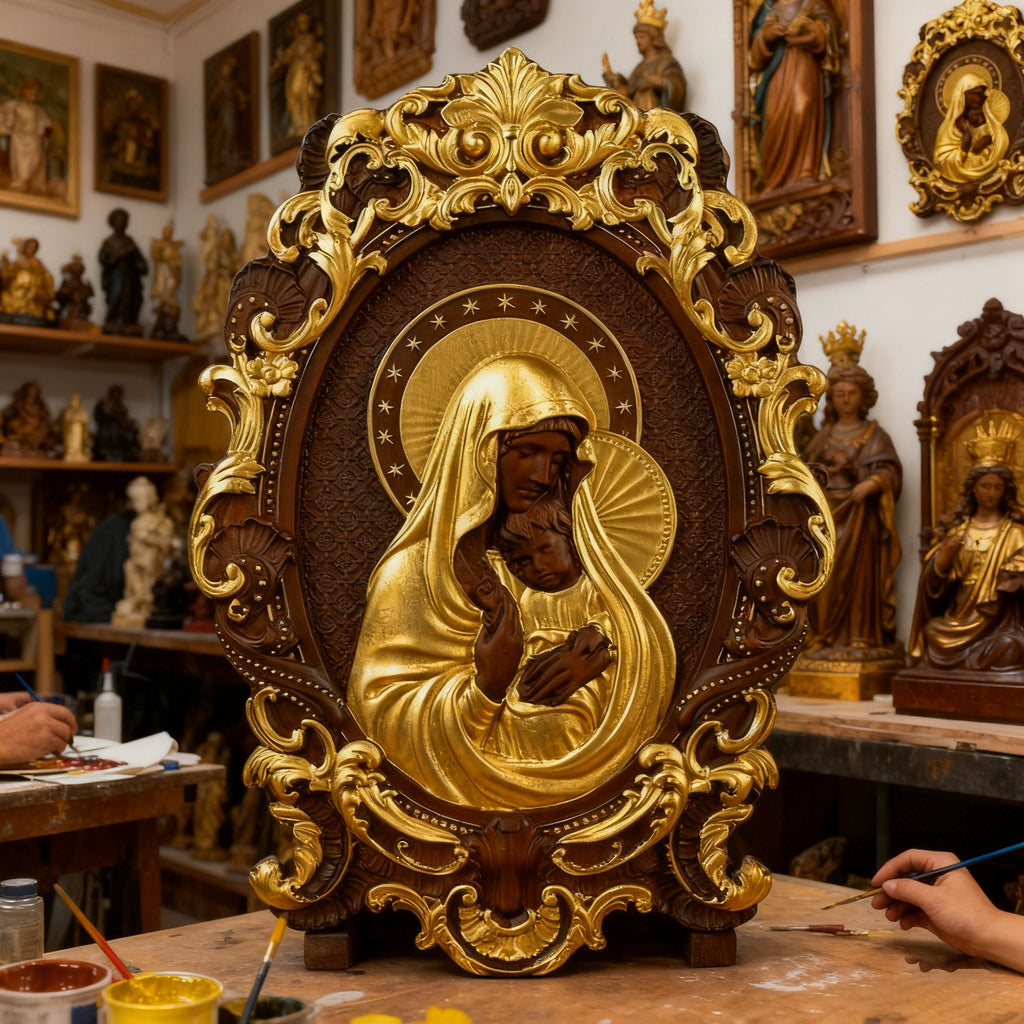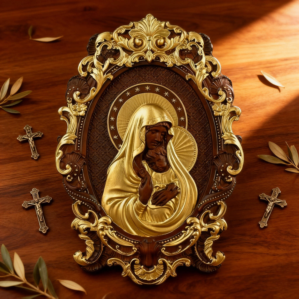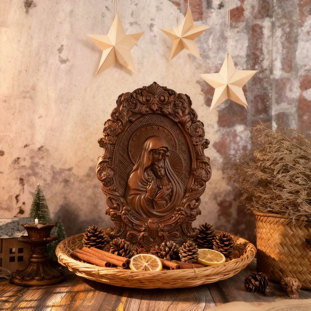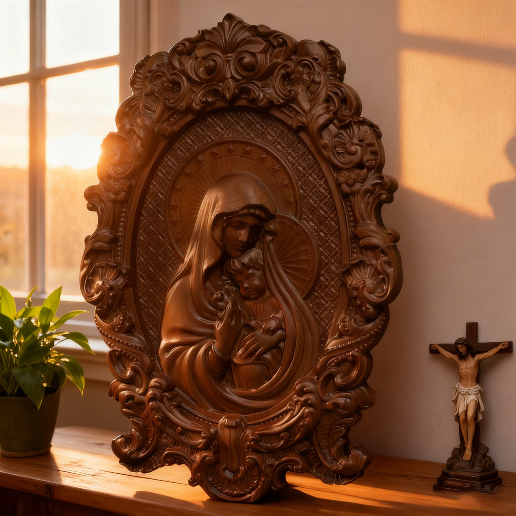 • Craftsmanship: 100% hand-carved + hand-painted – every fold of Mary’s veil, Jesus’ tiny features, and the ornate frame are shaped with reverent care.