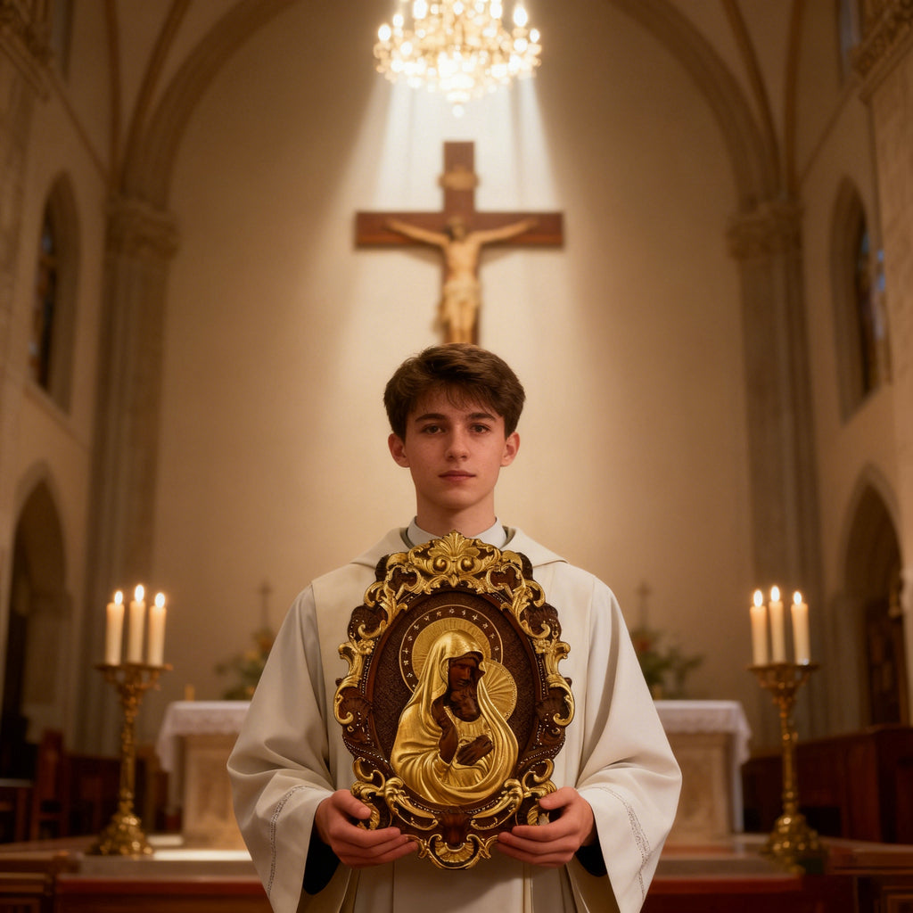 • The golden halos (adorned with stars for Mary, the “Star of the Sea”) reflect their holiness, while the intricate robes capture the softness of their bond.