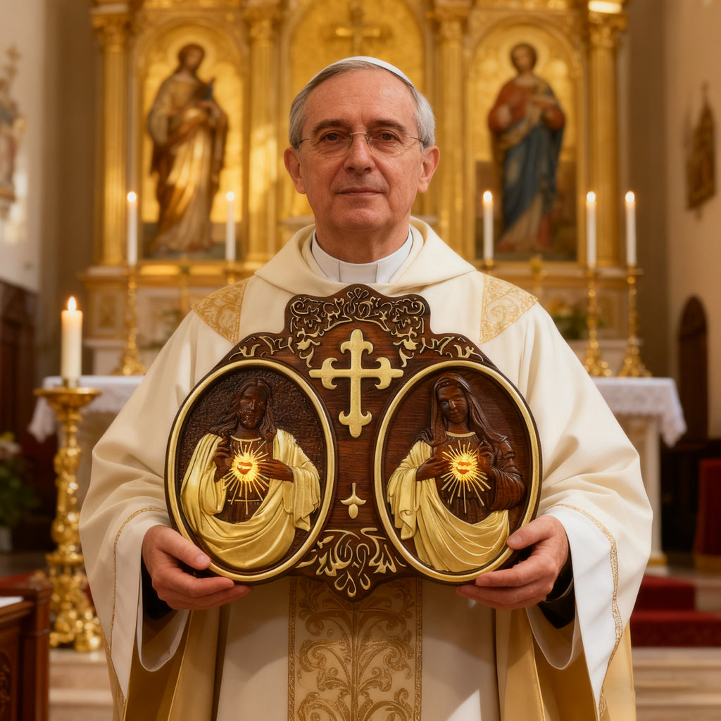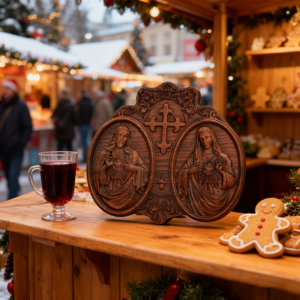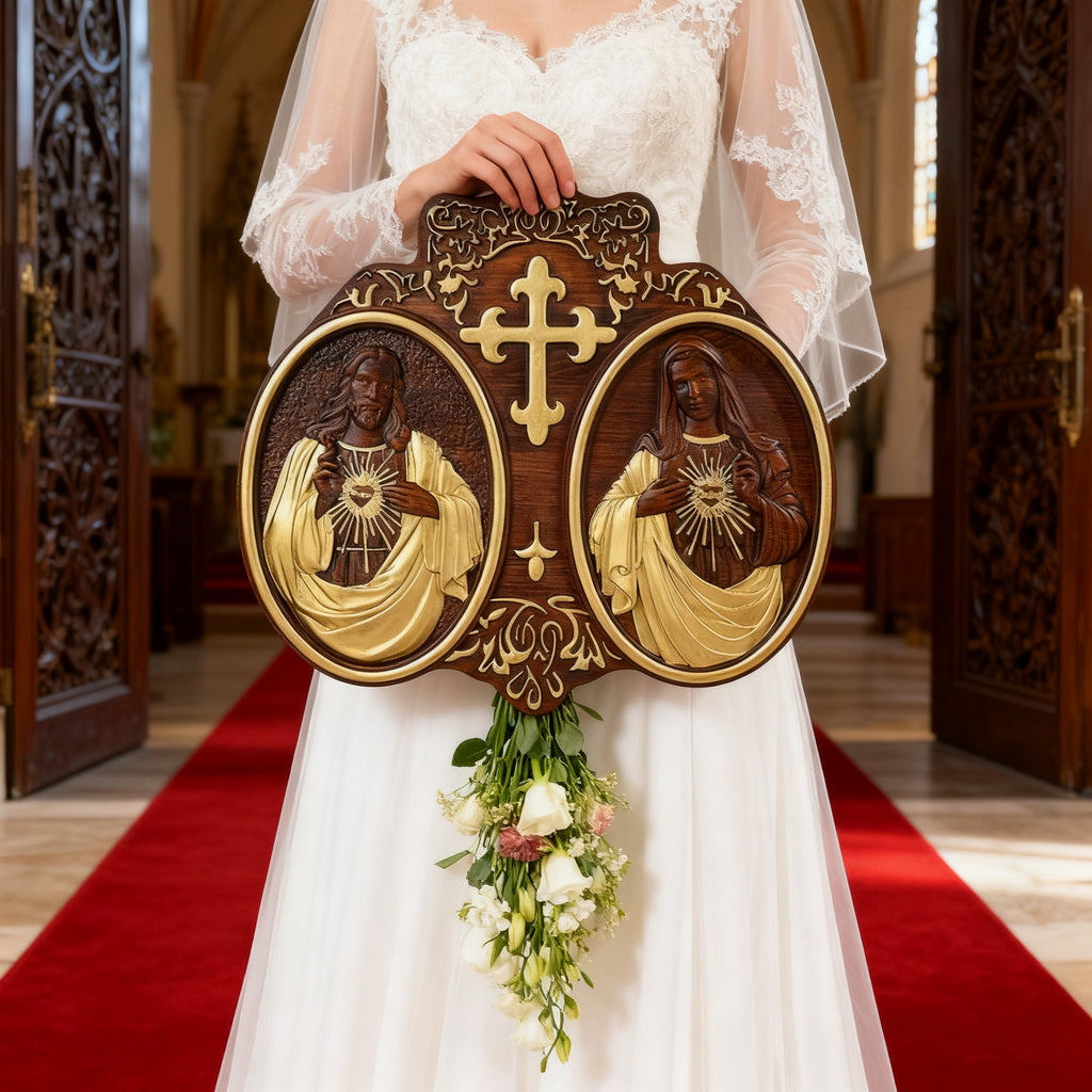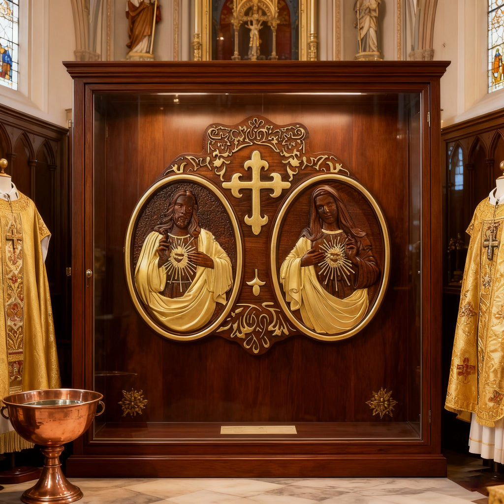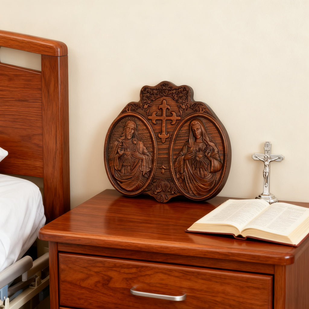 Devotional Hand-Carving: The intricate details—from the thorns on Jesus' heart to the delicate petals of Mary's roses—are carved with precision and reverence, capturing the essence of each sacred symbol.