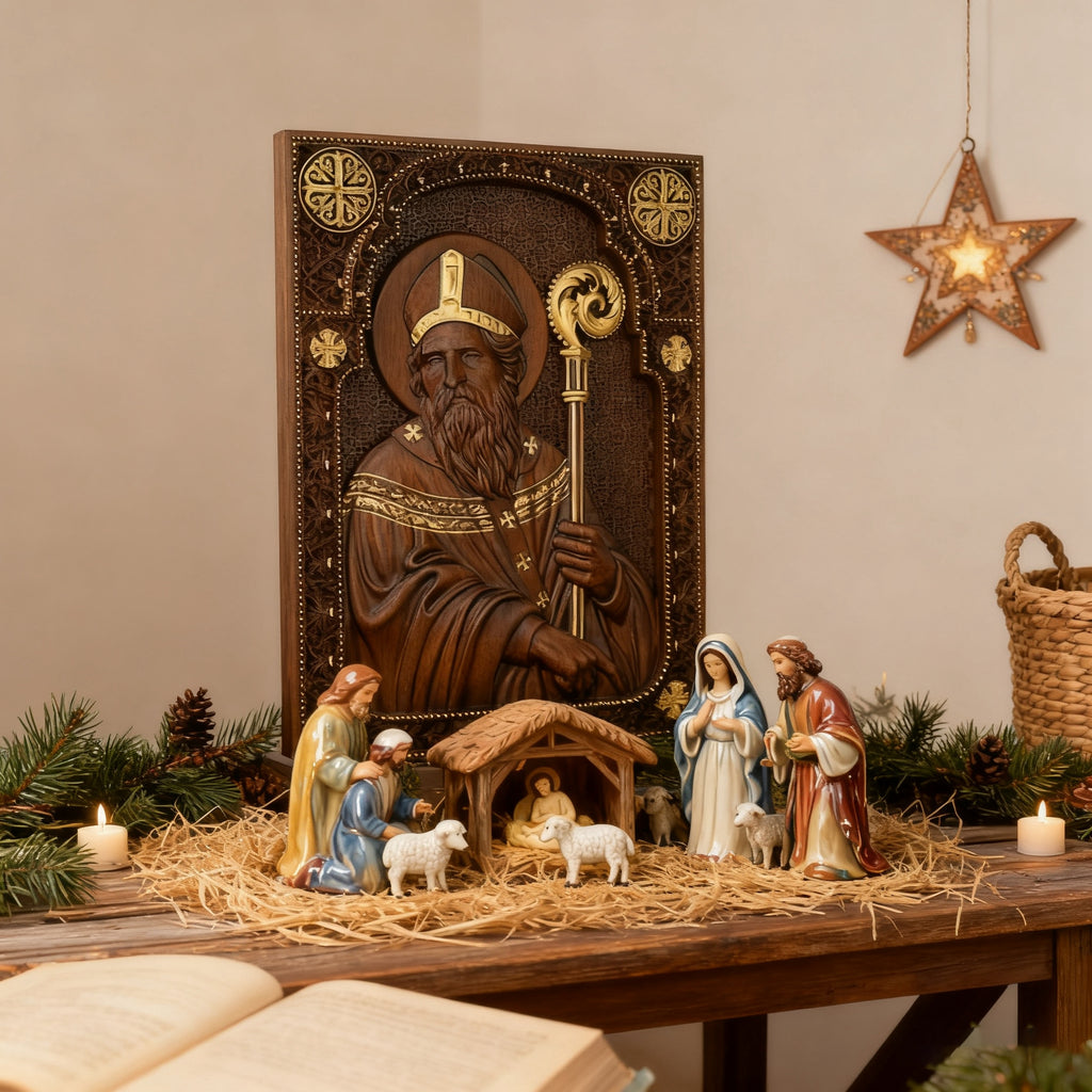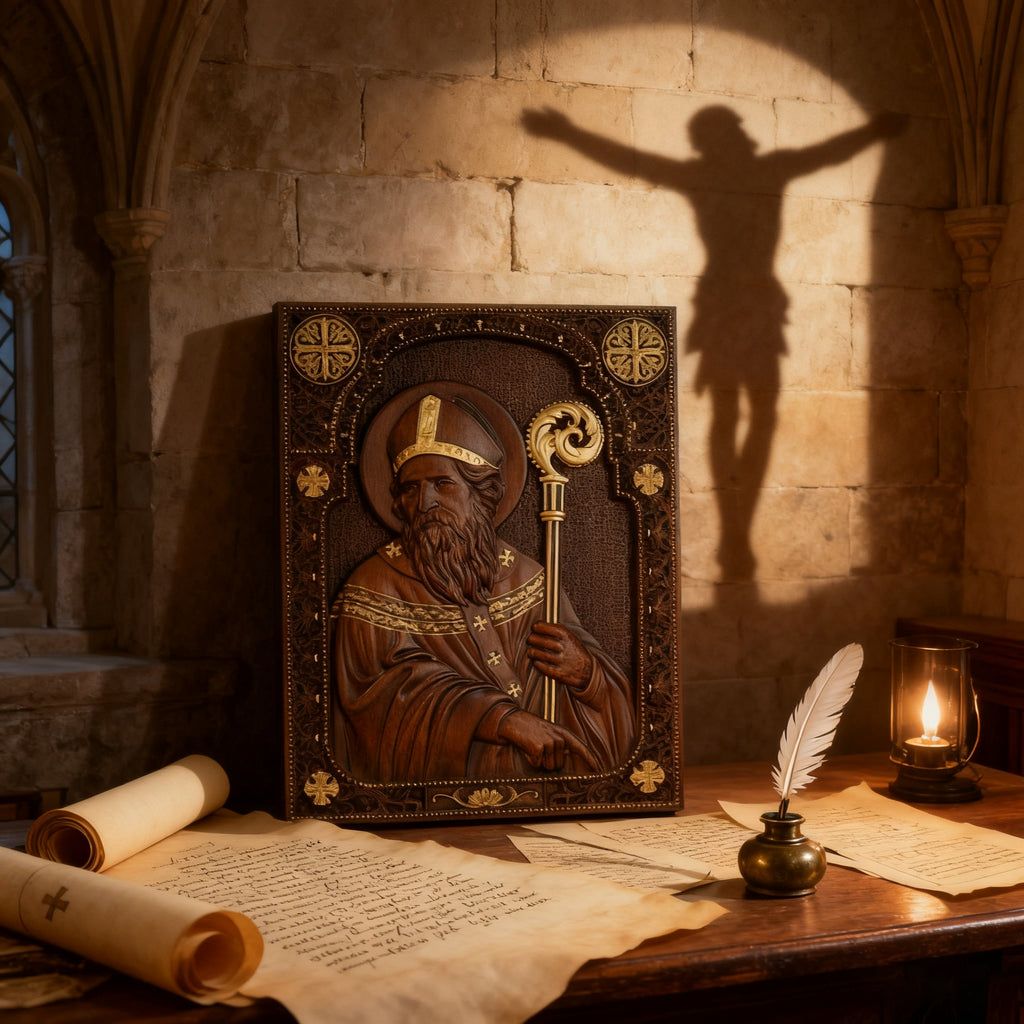 • Reverent Presence: St. Patrick wears a sacred hat adorned with golden elements, symbolizing divine calling