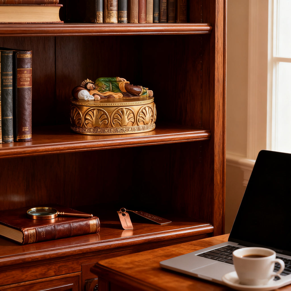 In the Christian tradition, St. Joseph is revered as the earthly father of Jesus, the husband of Mary, and the Patron Saint of Families—a figure of quiet strength, unwavering trust, and tender protection. This synthetic resin jewelry box, inspired by the “Sleeping St. Joseph” icon, weaves his spiritual legacy into your daily life: every time you place a necklace, ring, or earring inside, you’re not just storing a treasure—you’re embracing a promise of rest in trust and guardianship in obedience.
