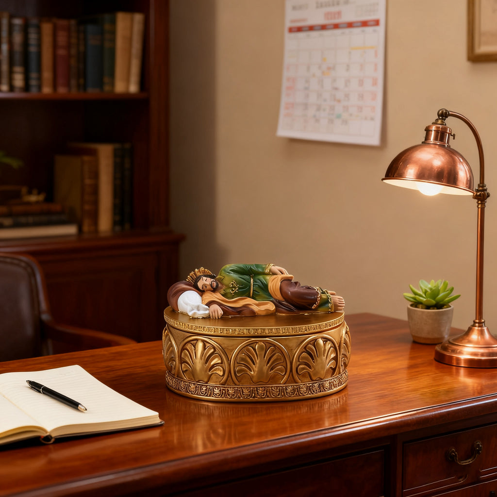 • Guardianship of what matters: Just as Joseph protected the Holy Family, this box safeguards your treasures as a reminder—your life’s “jewels” (relationships, memories, faith) are held in sacred care.