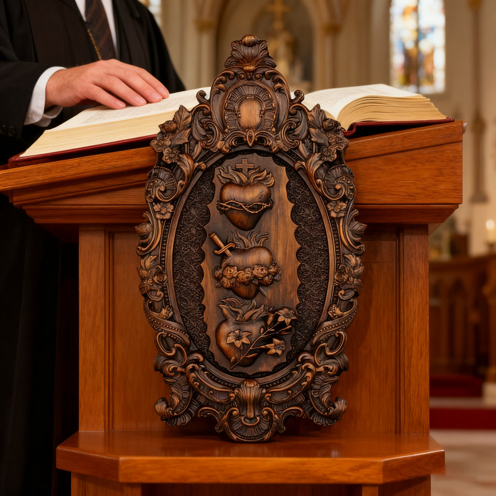 Meticulously handcrafted from solid wood, this piece captures the warmth and depth of its sacred subject matter. The careful attention to the symbolic details of each heart ensures it is a timeless heirloom, perfect for creating a space where prayer and family life can flourish.