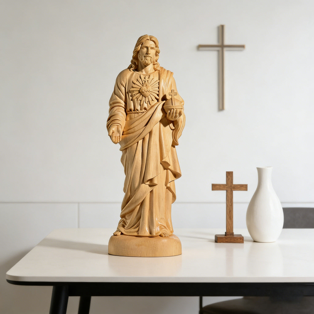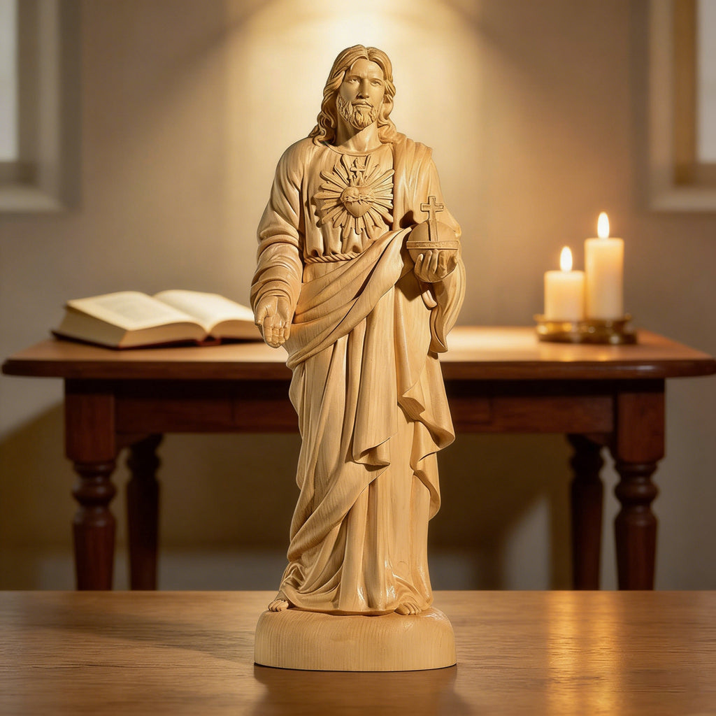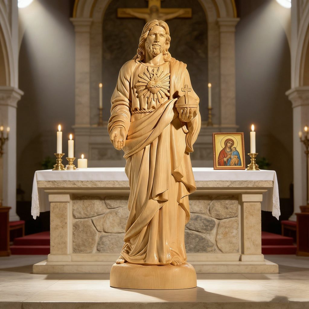 This hand-carved yellow poplar wood statue brings the devotion of the Sacred Heart of Jesus into visible, tangible form. Shaped from warm, enduring wood, it reflects a love that is steady, patient, and faithful—inviting moments of quiet prayer, reflection, and trust in His mercy.