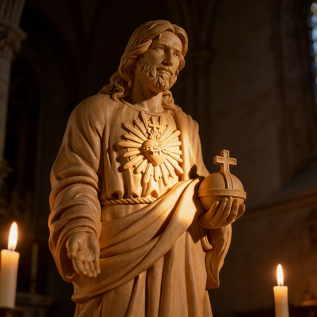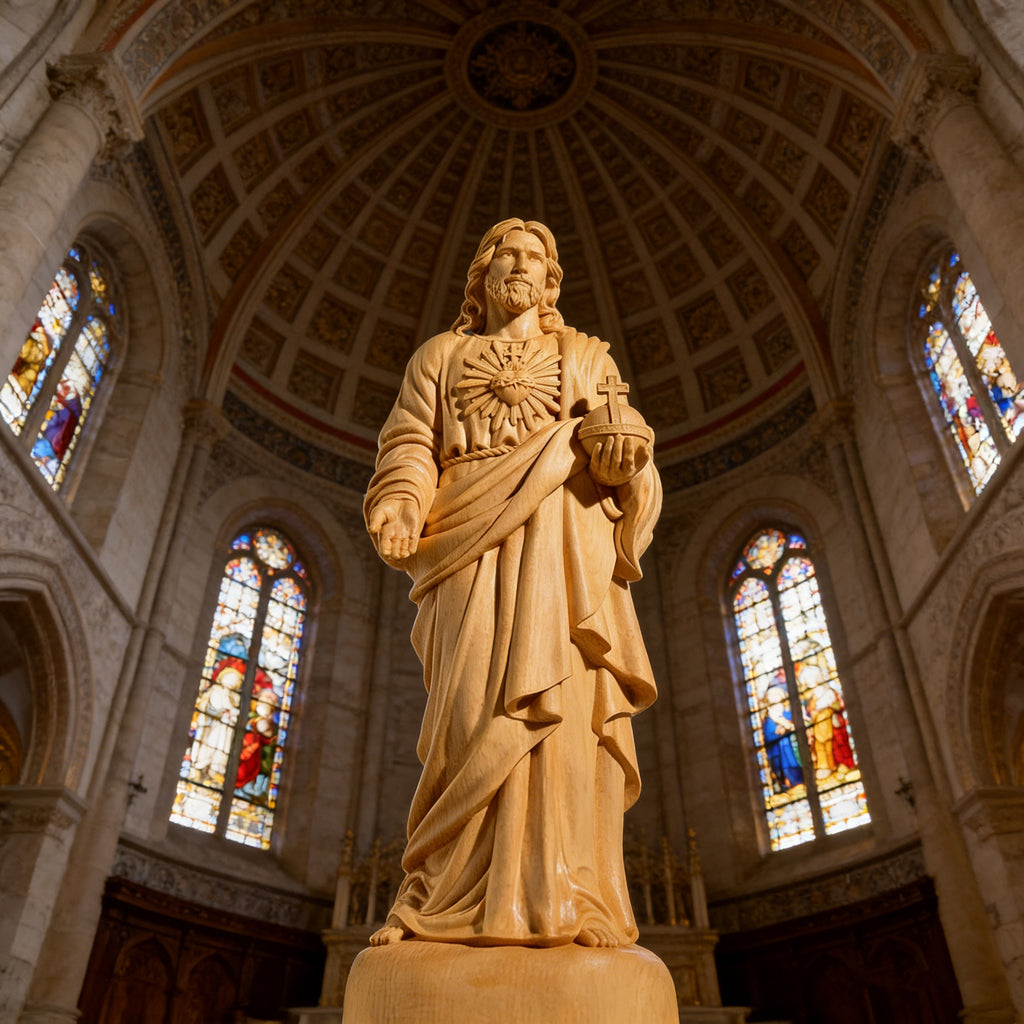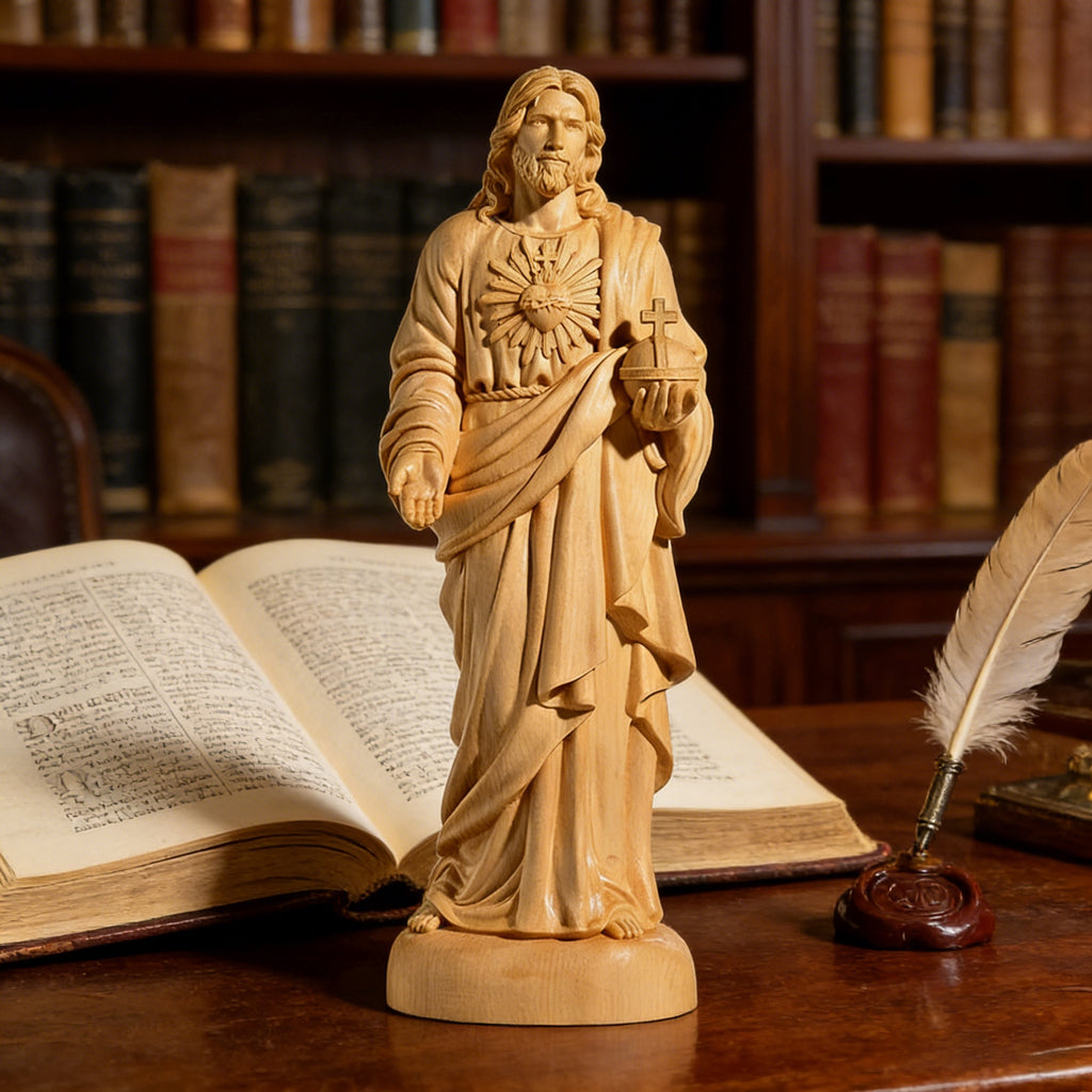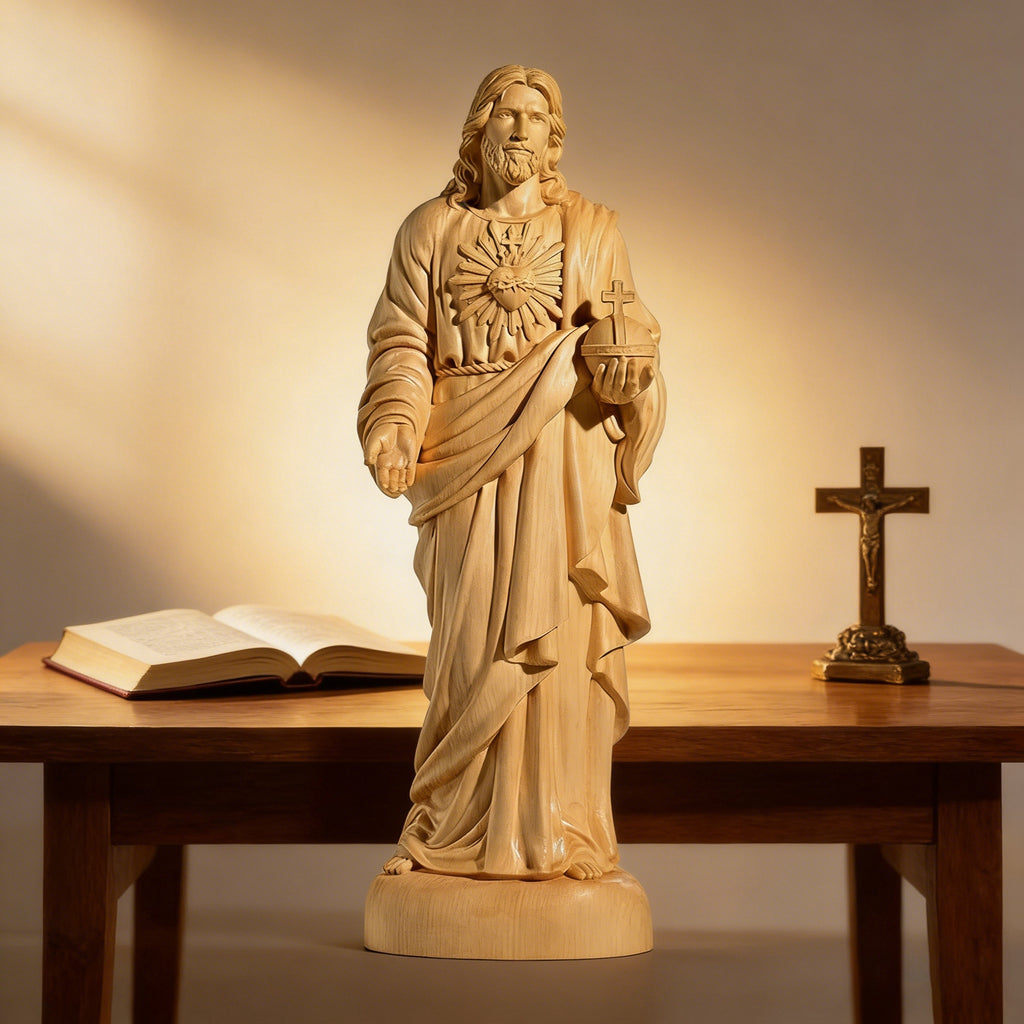 This hand-carved yellow poplar wood statue brings the devotion of the Sacred Heart of Jesus into visible, tangible form. Shaped from warm, enduring wood, it reflects a love that is steady, patient, and faithful—inviting moments of quiet prayer, reflection, and trust in His mercy.