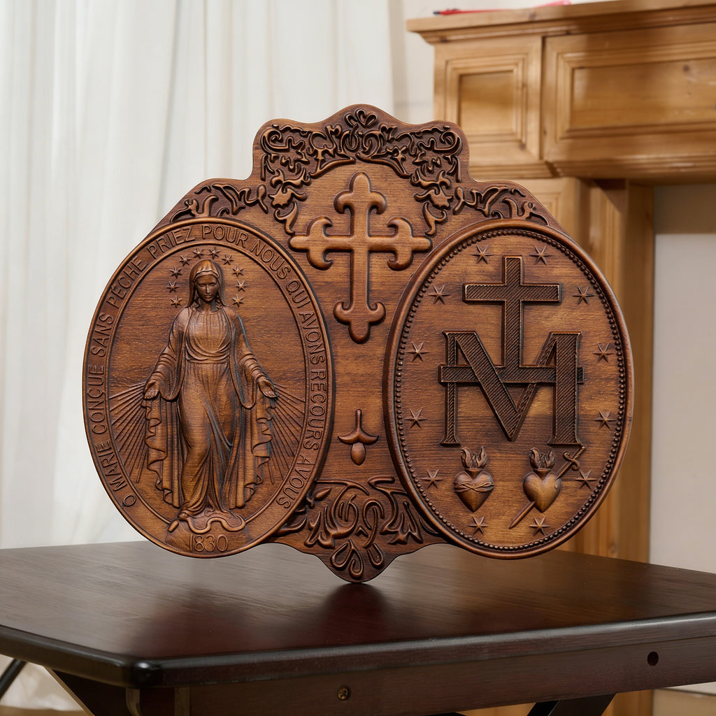 Miraculous Medal Wood Carving Decor - Medal of Our Lady of Graces
