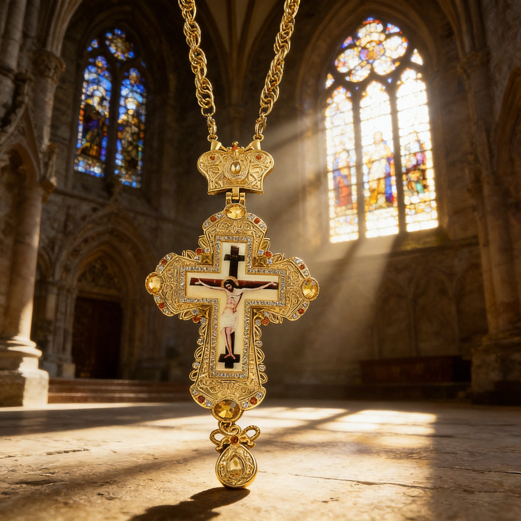 This ornate pectoral cross is far more than ecclesiastical regalia. It is a tangible, weighty symbol of the bishop's sacred charge—to bear the image of Christ Crucified before the people and to carry the pastoral care of the flock upon his heart.