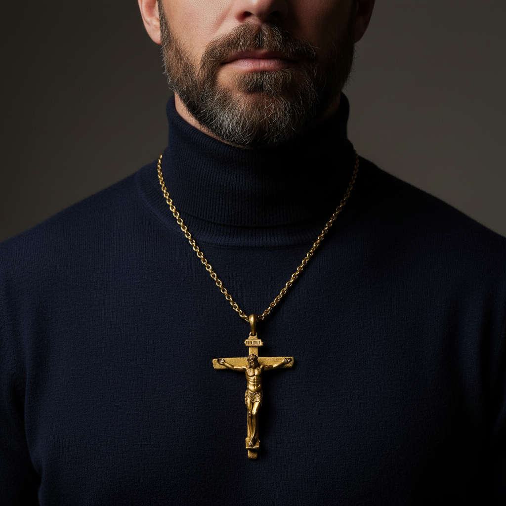 The polished cross dazzles; the sandblasted cross invites touch. This is the cross of a carpenter, not a king enthroned. It echoes the humility of the One who “made himself nothing, taking the form of a servant” (Philippians 2:7). The matte finish speaks of a faith that does not need to shine to be true—a faith that is comfortable in the quiet, in the ordinary, in the hands of the weary. When you wear this crucifix, you are not making a statement; you are making a prayer.