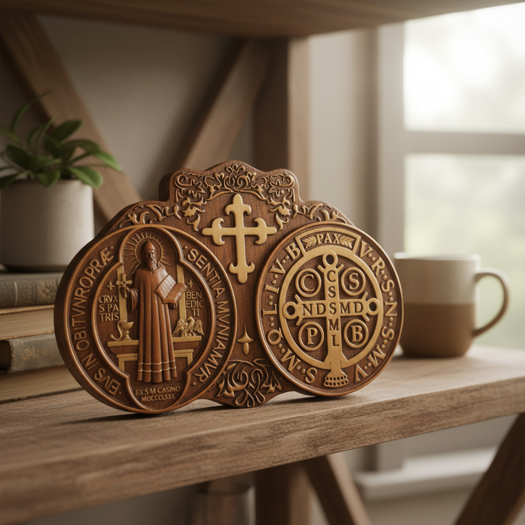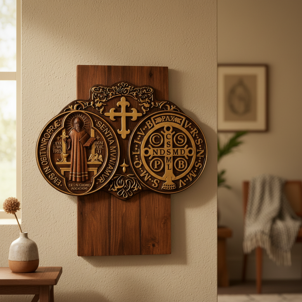 This exquisitely crafted wooden plaque is not merely religious art but a spiritual shield passed down through centuries. A powerful sacramental bringing the intercession of St. Benedict and the authority of Christ's Cross into your daily life.