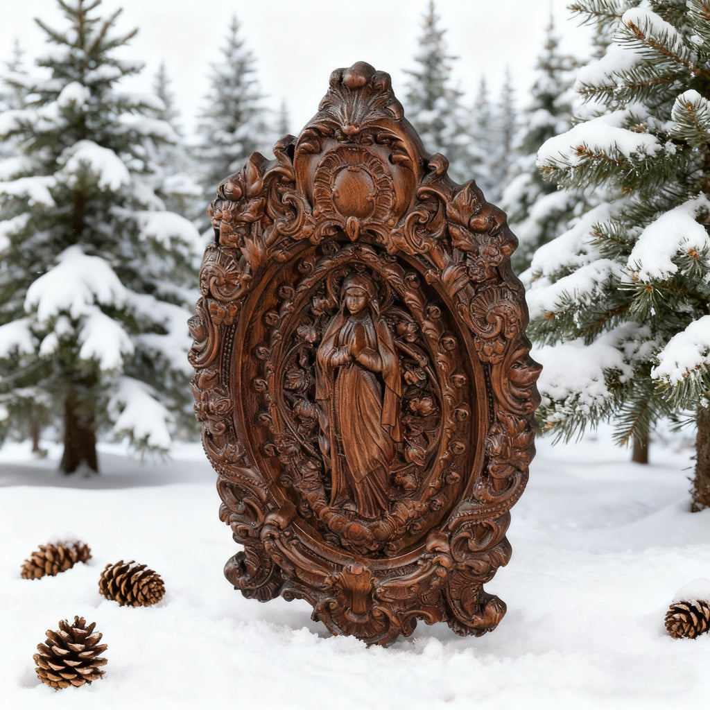 Honor the Blessed Virgin Mary with this handcrafted beechwood icon—where intricate leaf carvings wrap around Mary’s gentle form, a testament to her faithfulness and role as the Mother of God, designed to be a sacred centerpiece in your home.