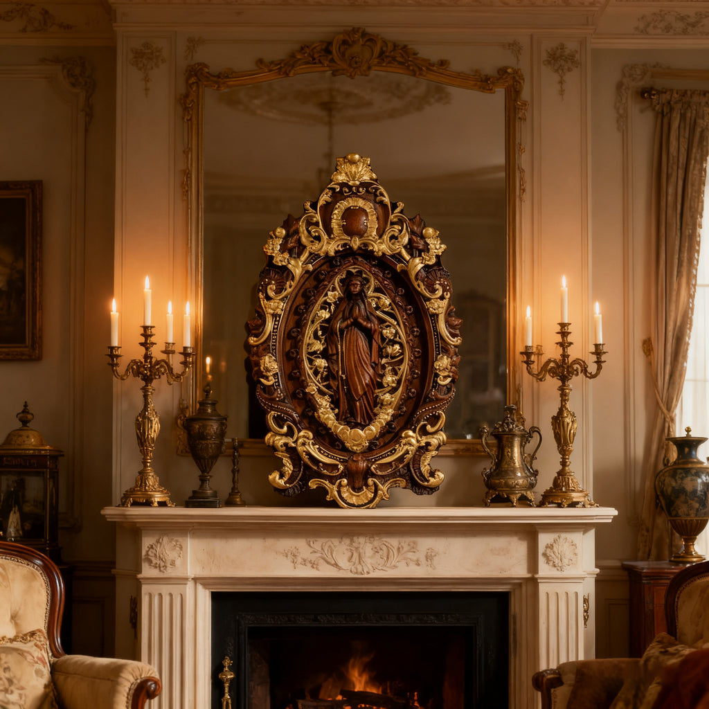 • Ornate Gilded Frame: Echoes the holiness of heaven, framing Mary as a bridge between earth and the divine.