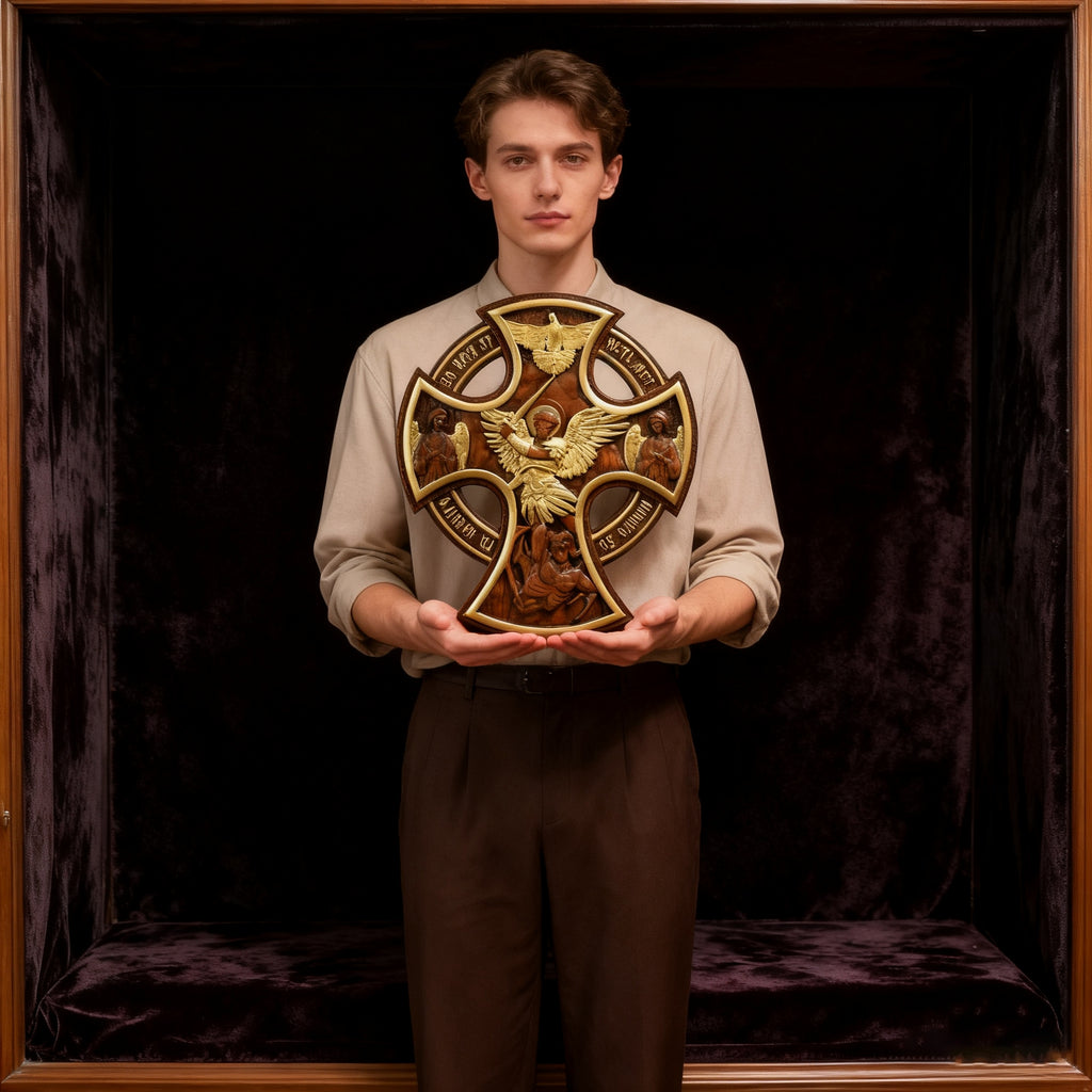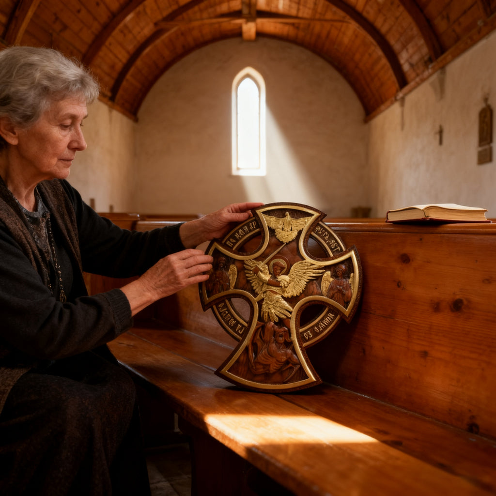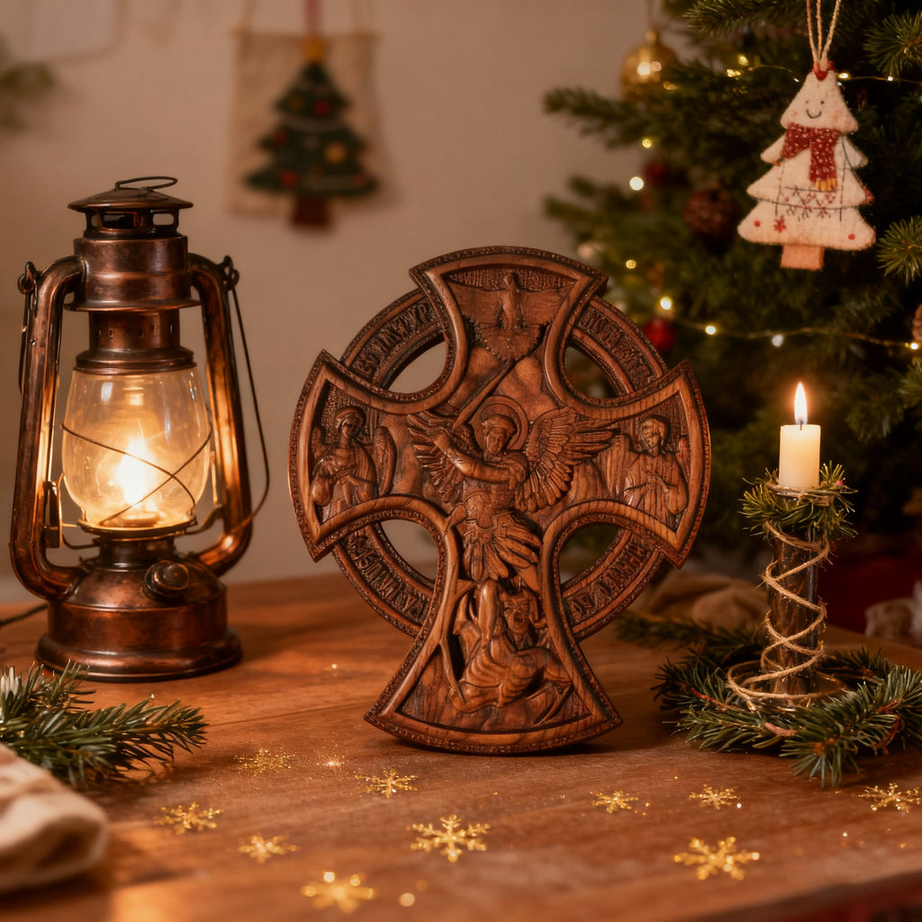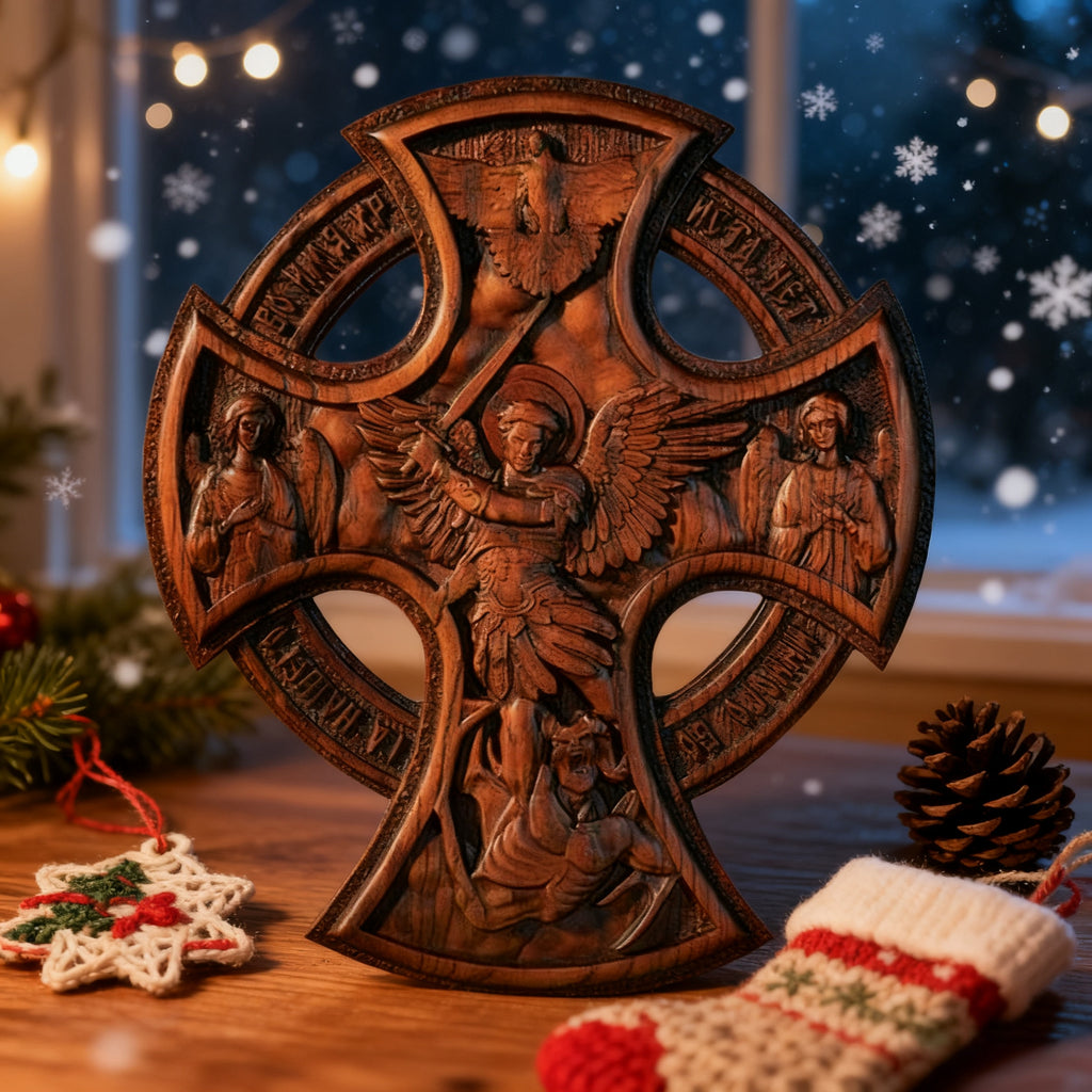 This Celtic cross isn’t just decor—it’s a visual testament to Saint Michael the Archangel (whose name means “Who is like God?”) and his victory over evil (Revelation 12:7-9). Every carved element carries sacred meaning: