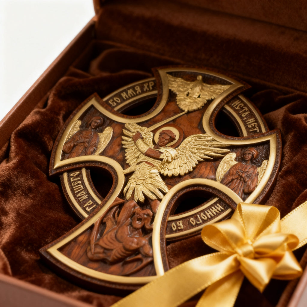• Saint Michael: Gilded wings outstretched, sword raised, standing firm over the defeated dragon (a symbol of Satan and temptation).
