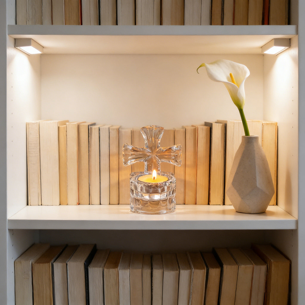 • Cross Accent: The clear glass cross (with textured details) is a visual nod to Christ’s sacrifice—when lit, the flame glows through it, like “grace shining through suffering.”