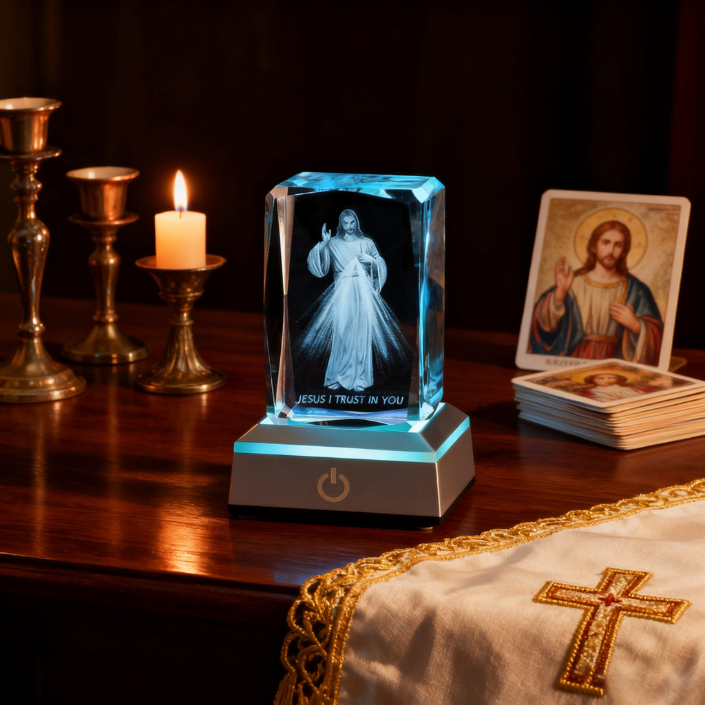 This lamp brings the profound devotion to the Divine Mercy of Jesus into your home. Rooted in the revelations to St. Faustina, it serves as a daily, visual invitation to contemplate the boundless ocean of grace flowing from the heart of Christ and to respond with the simple, powerful prayer: “Jesus, I trust in You.”