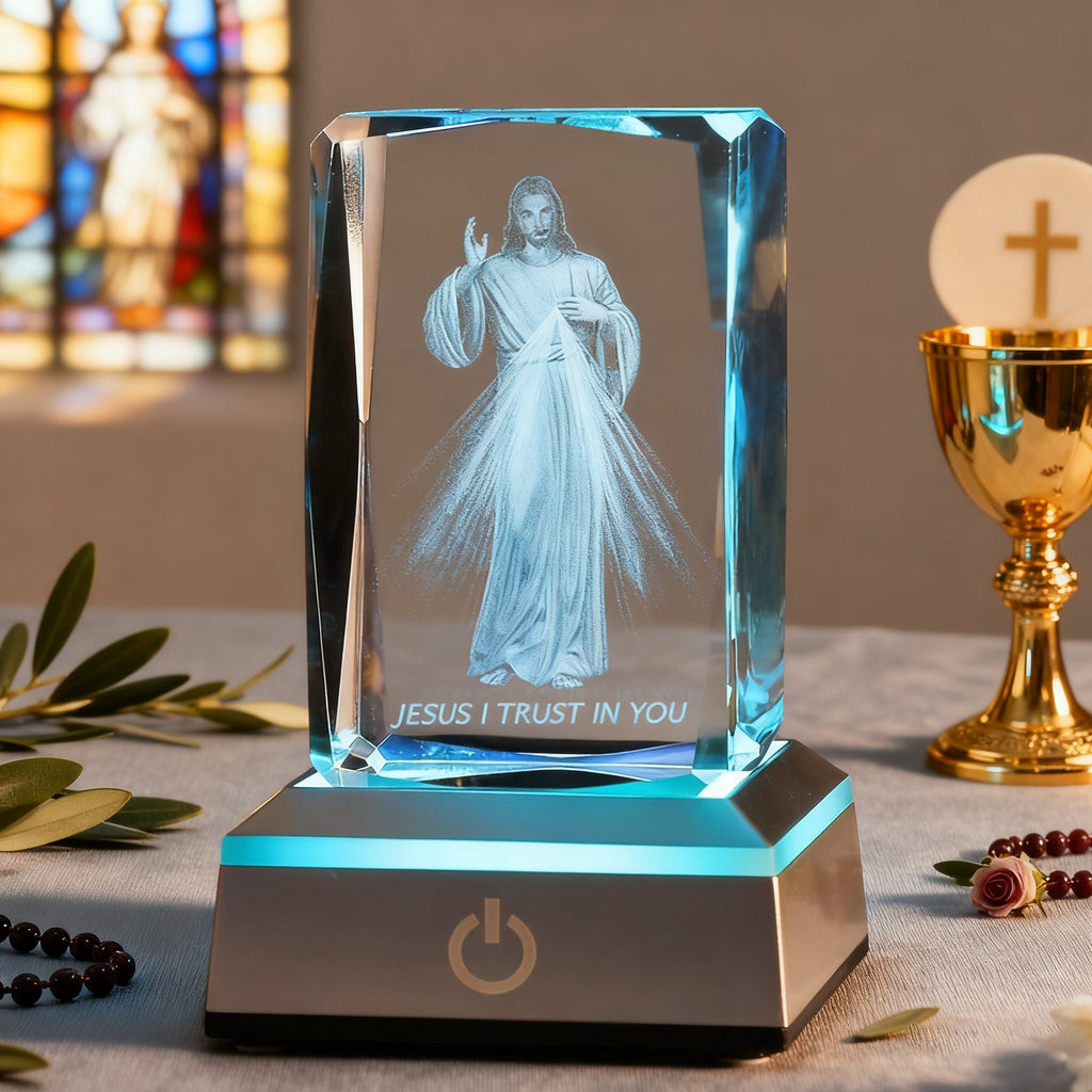 Material: Clear, high-quality crystal, laser-engraved with the authentic Divine Mercy image and prayer