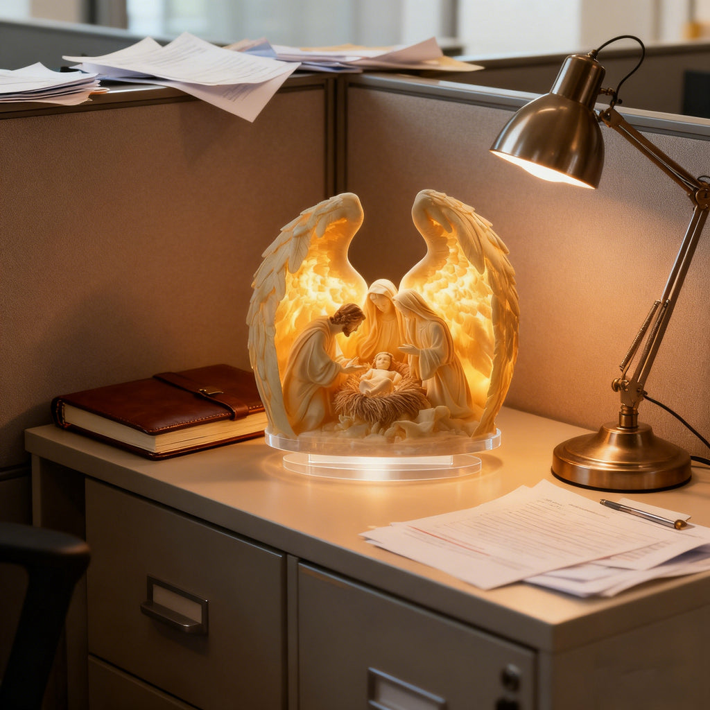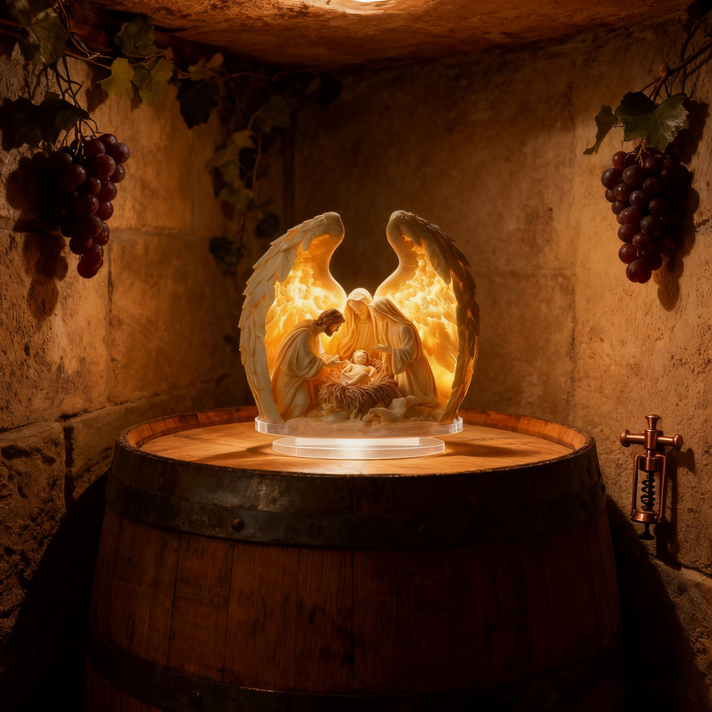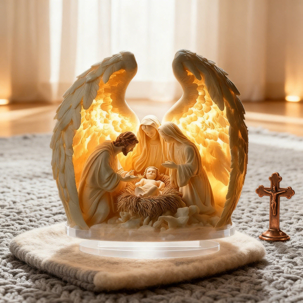• Sacred Nativity Symbolism: The Holy Family gathers around baby Jesus, while the angel wings encircling them evoke the heavenly announcement of His birth (Luke 2:13-14). The soft glow mirrors the “light of the world” that Jesus brought to humanity.