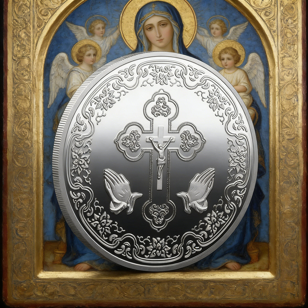 • Back (Cross + Praying Hands): The ornate cross (with Christ’s figure) + folded hands symbolize redemption and the prayerful trust we place in Him.