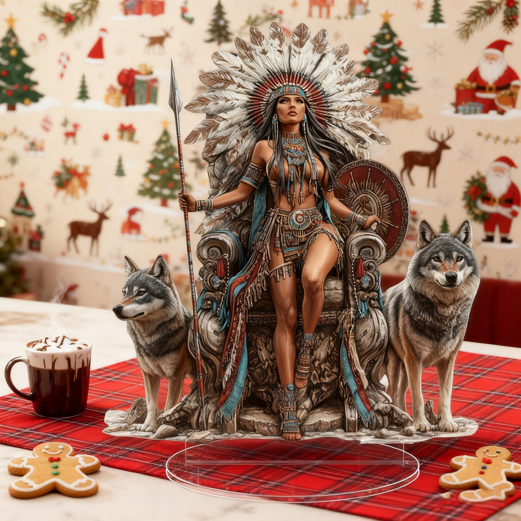 • Design: Intricate Native American-inspired art (feathered headdress, symbolic spear/shield, wolf companions) printed on premium clear acrylic
