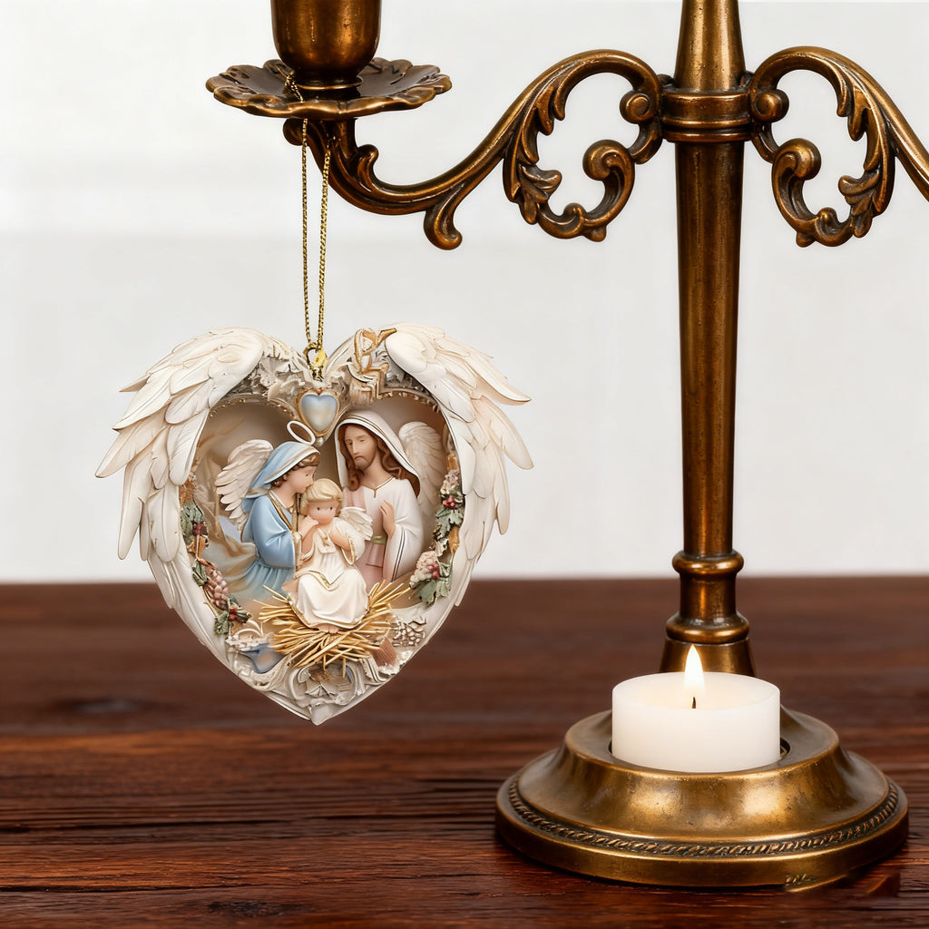 This ornament captures the holy nativity—Mary, Joseph, and the infant Jesus—nestled in a winged heart frame (a symbol of divine love). Adorned with delicate foliage and straw (echoing the humble manger), it’s a gentle reminder of Christmas’s true meaning: hope, joy, and the gift of new life ✨.