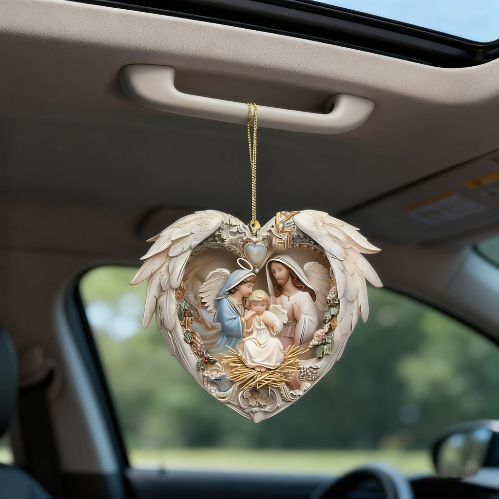 • Design: 2D acrylic flat ornament (printed to mimic intricate 3D details) featuring the holy family + angel wings.