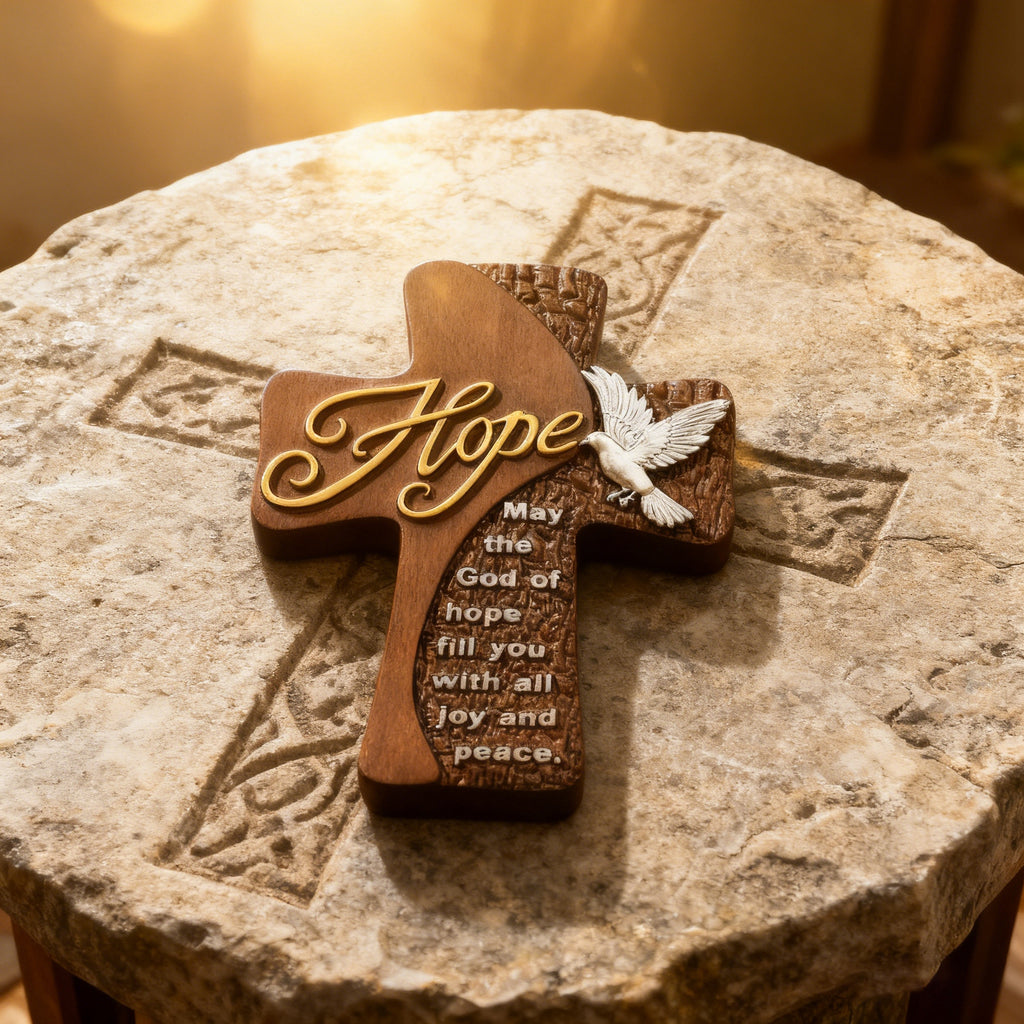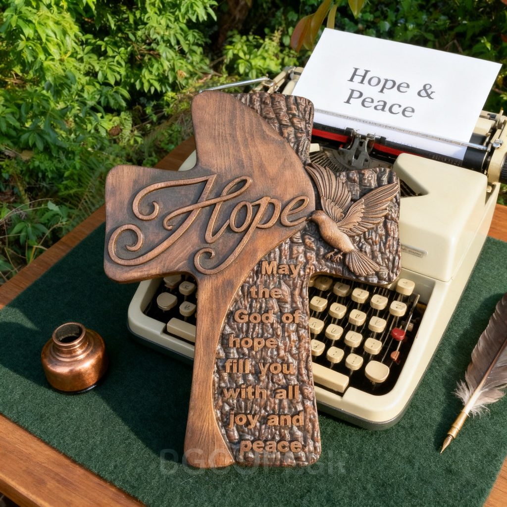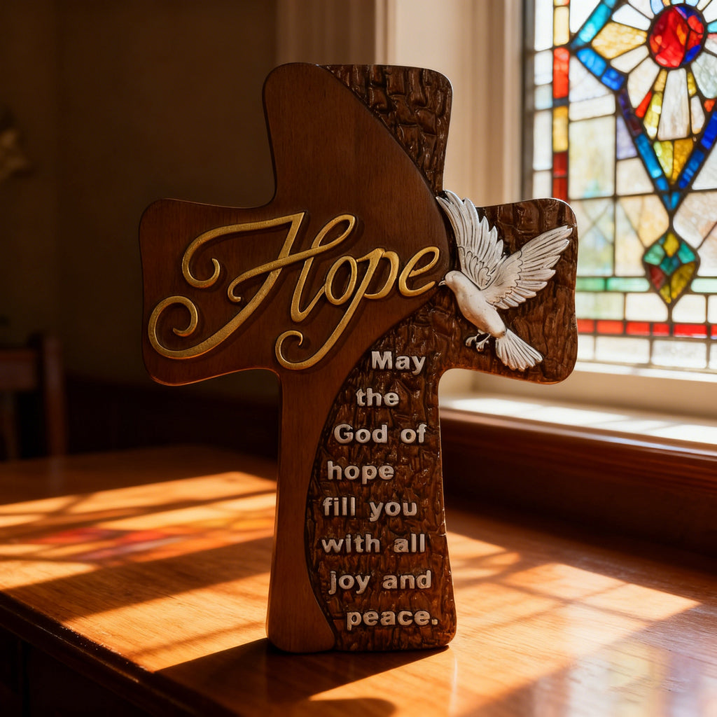 • Design: Elegant “Hope” script + a detailed white dove (symbol of the Holy Spirit), paired with: “May the God of hope fill you with all joy and peace” (Romans 15:13).