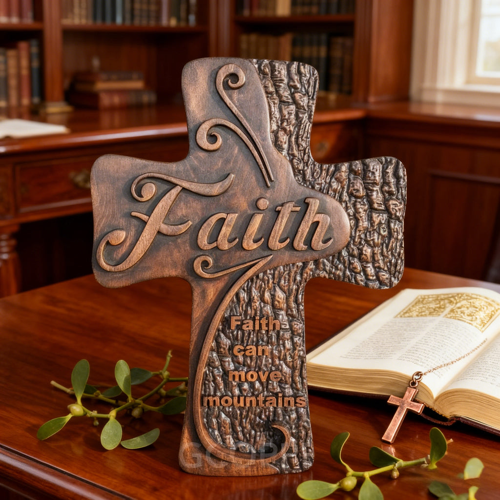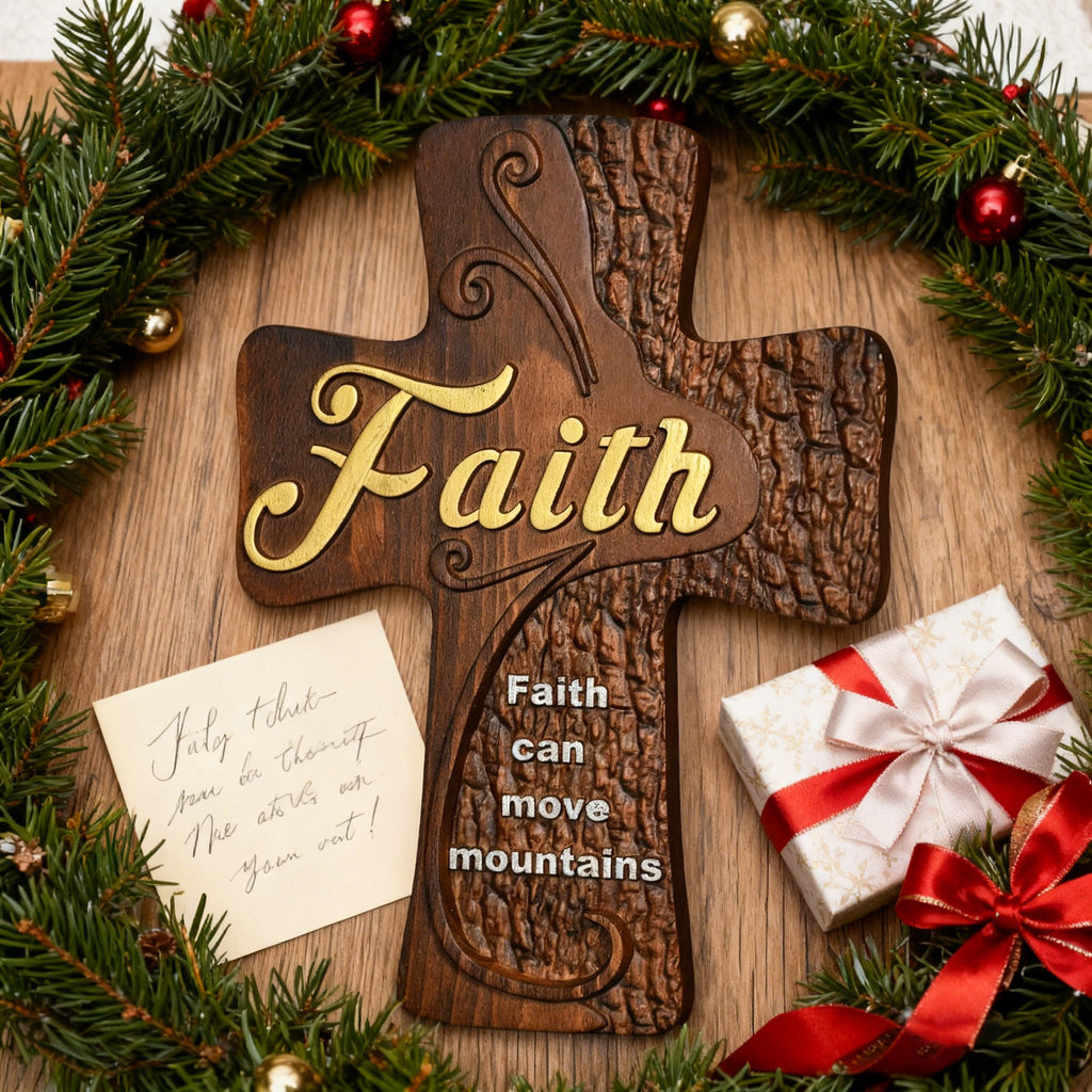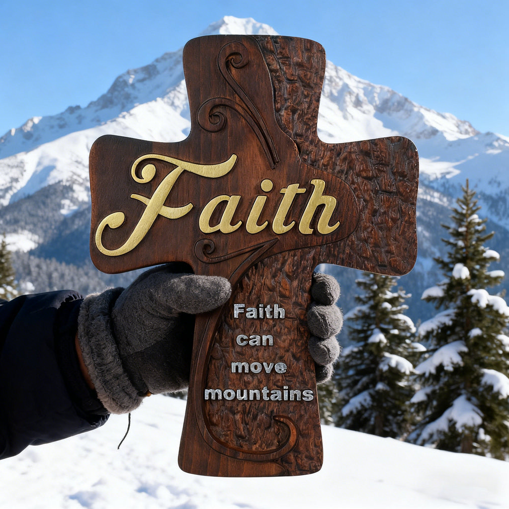 • Design: Bold gilded “Faith” lettering paired with the iconic verse: “Faith can move mountains” (Matthew 17:20).
