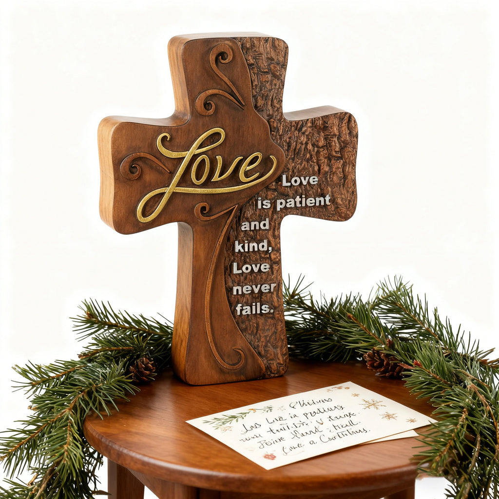 • Design: Swirling gilded “Love” lettering paired with 1 Corinthians 13’s promise: “Love is patient and kind, Love never fails”.