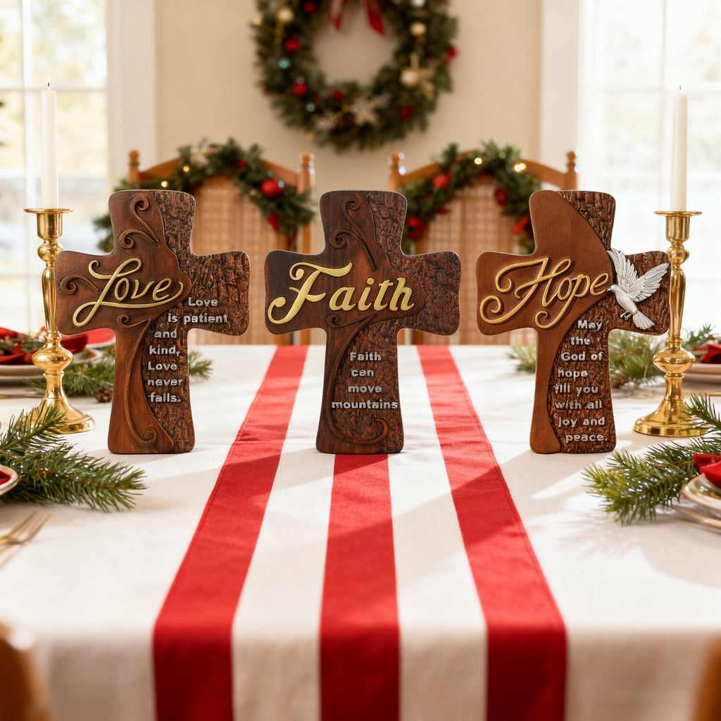 Embrace the three cornerstones of Christian life with the “Faith, Hope, Love” Hand-Carved Wood Cross Set – each piece a sacred blend of artistry, Scripture, and the quiet power of your beliefs.