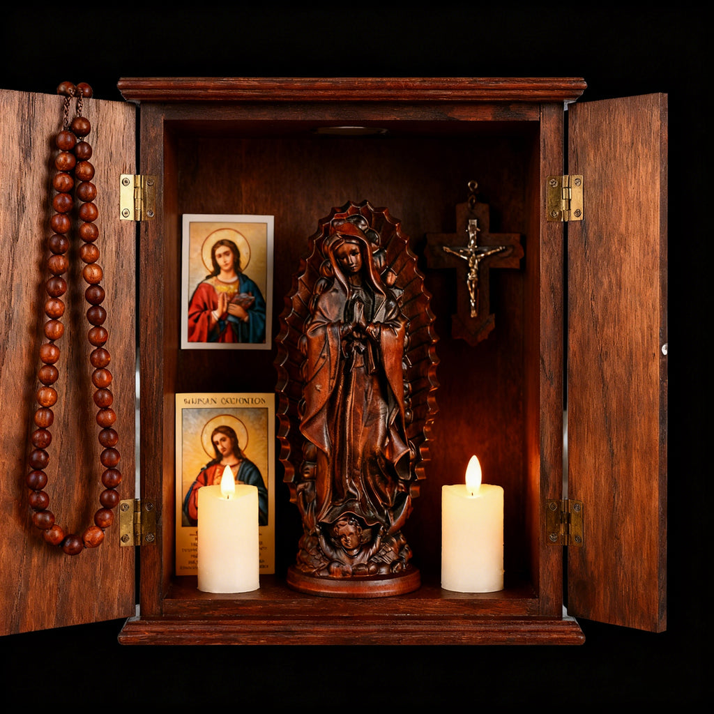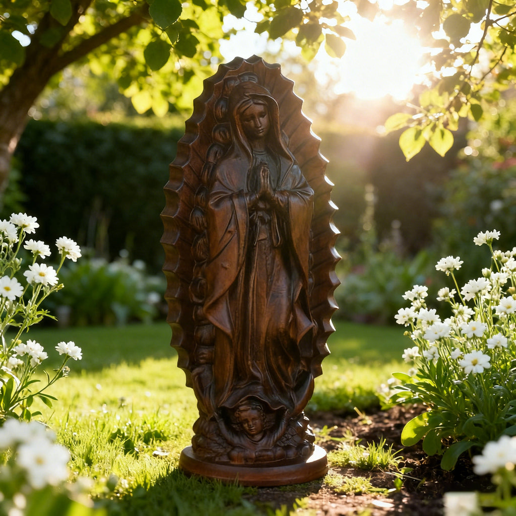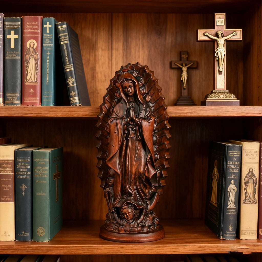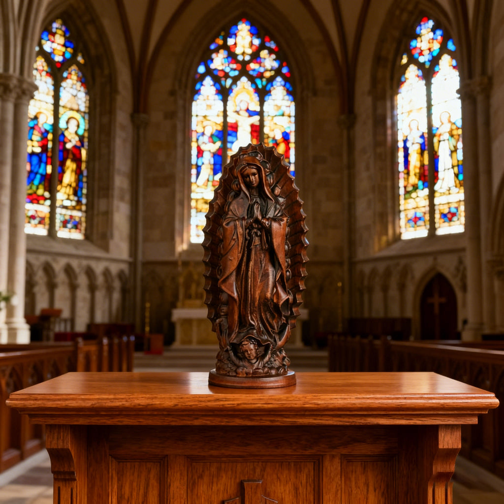 Our Lady of Guadalupe is the Patroness of the Americas and one of the most beloved images in Catholic devotion. This wooden sculpture—hand-carved by artisans at the BGCOPPER studio—captures her gentle mercy, maternal protection, and radiant grace.