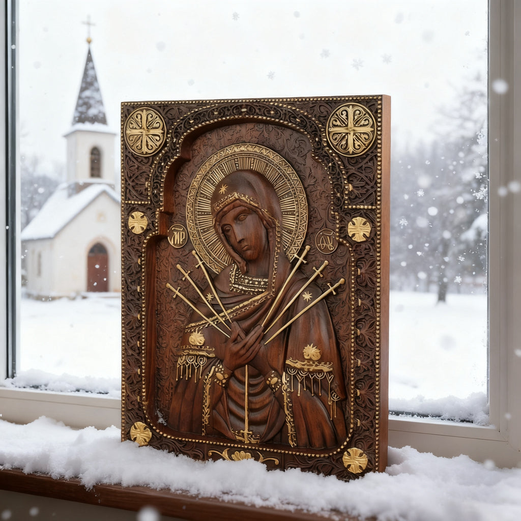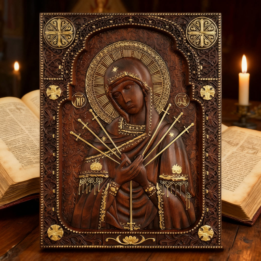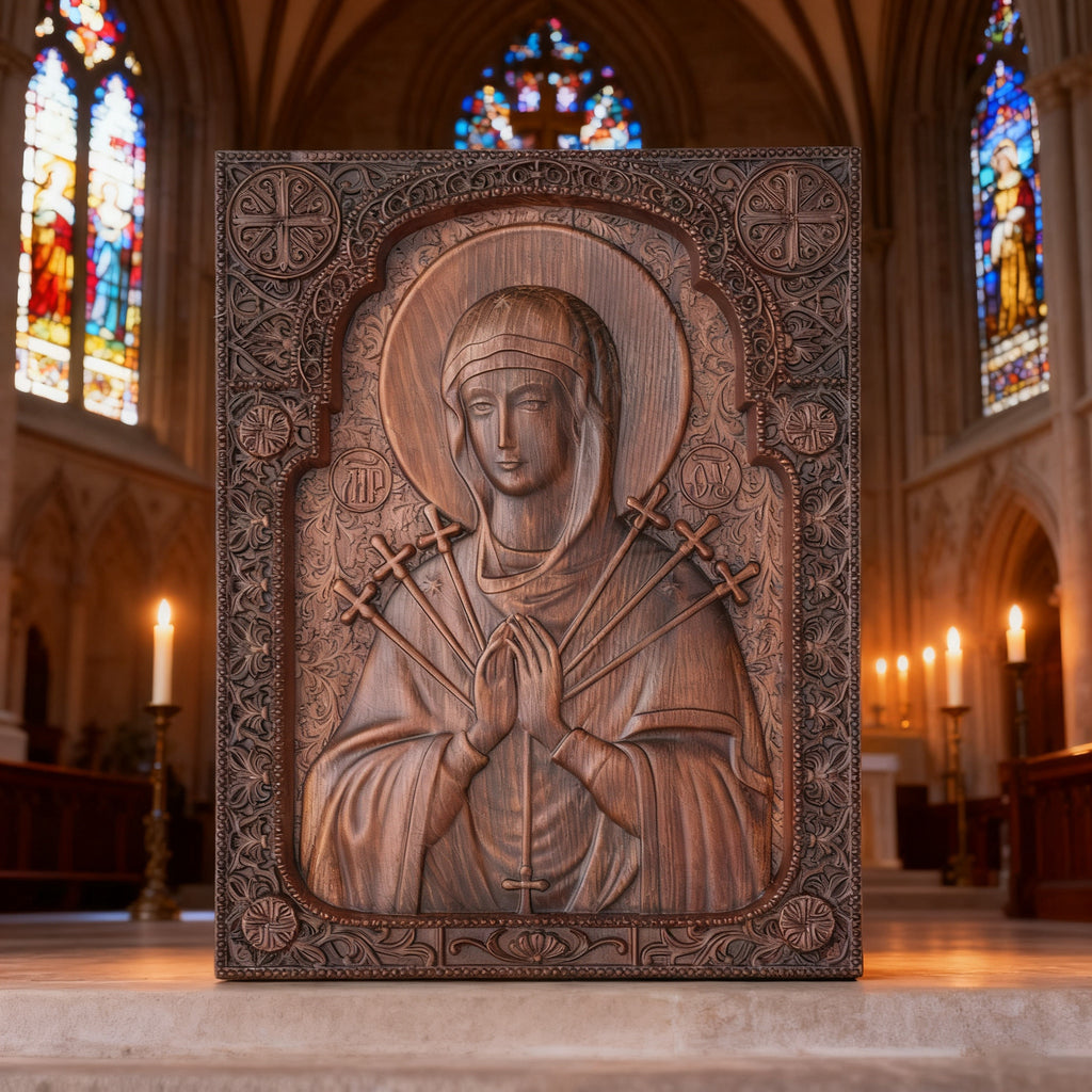 In the Catholic tradition, the Seven Sorrows of the Blessed Virgin Mary are a profound devotion that leads us deeper into the Paschal Mystery. This hand-carved piece is not merely an artwork—it is a sacramental designed to accompany you in prayer, helping you unite your sufferings with hers and find hope in redemptive love.