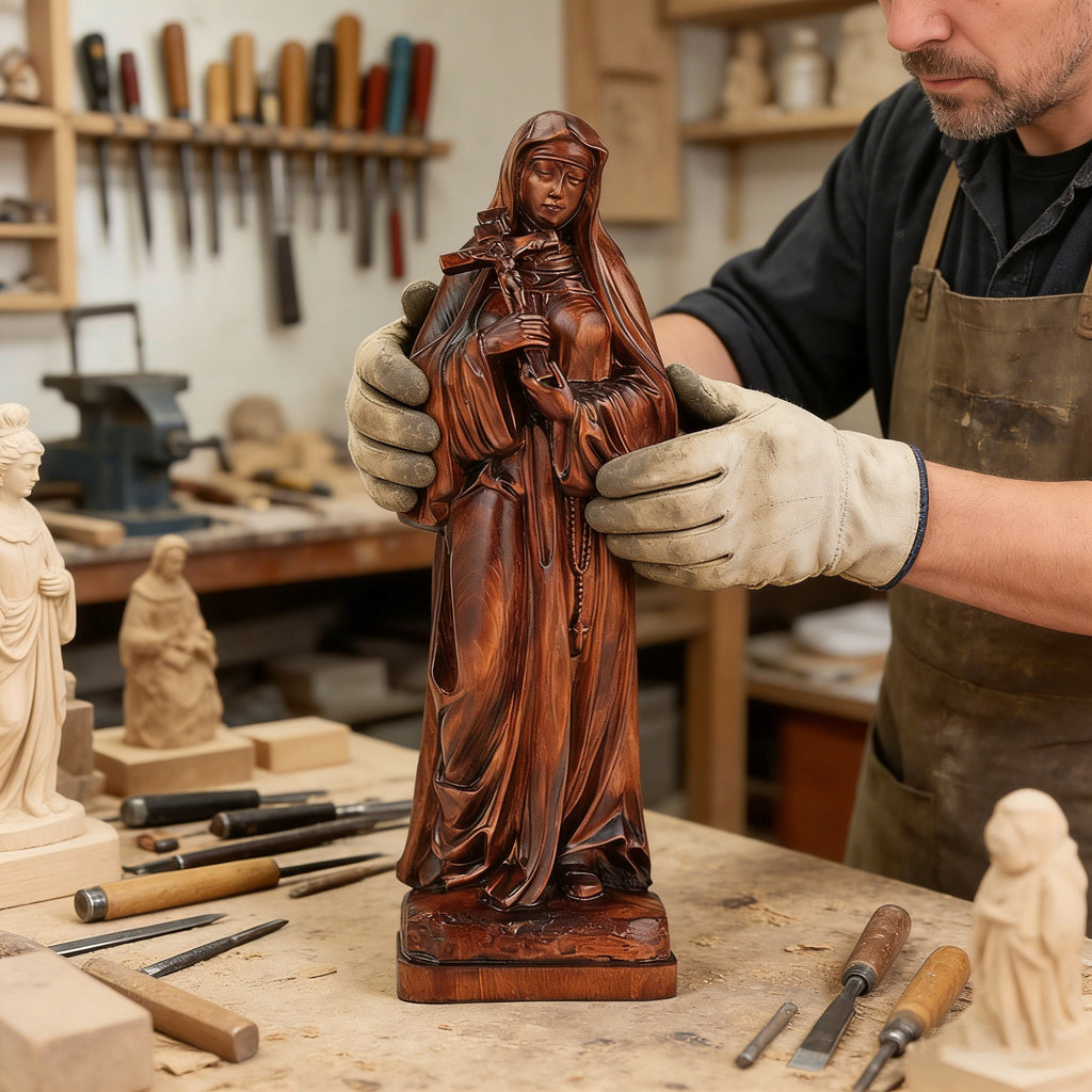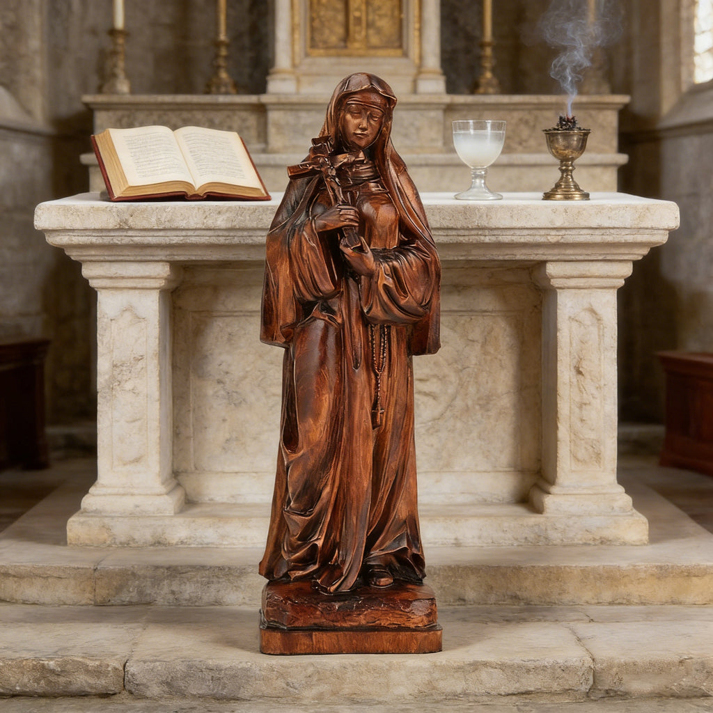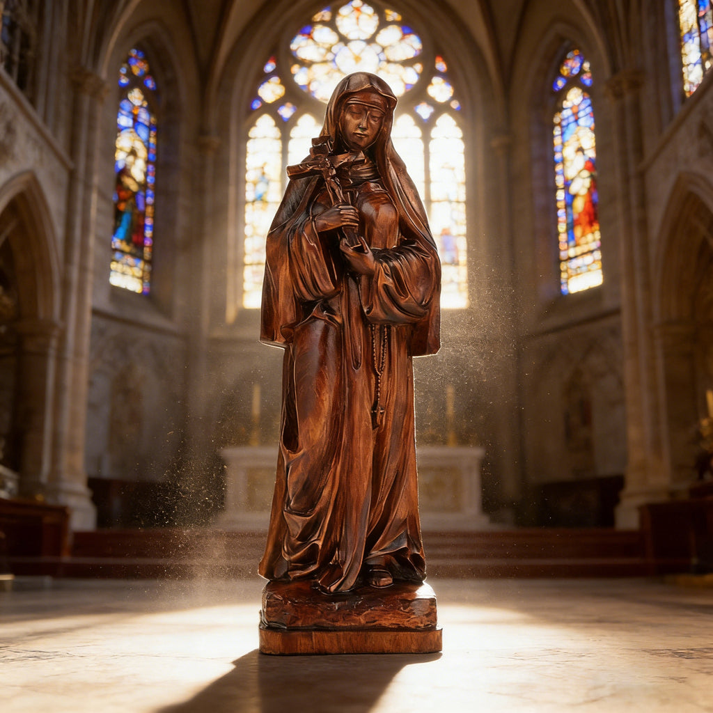 Crafted from selected wood, this sculpture meticulously depicts Saint Teresa of Avila. Her robe flows gracefully, headscarf softens her brow, and her tranquil expression embodies peace. Holding a cross, with a rosary hanging by her side, every fold of her garment is vividly carved. Each detail—from her serene facial features to the delicate lines of her attire—faithfully restores her sacred aura, merging artistry with faith to emanate silent solemnity.