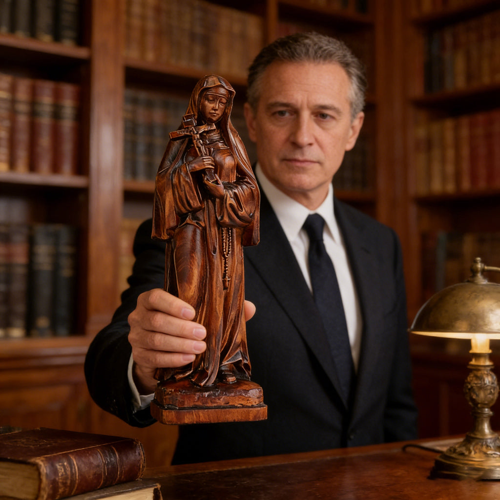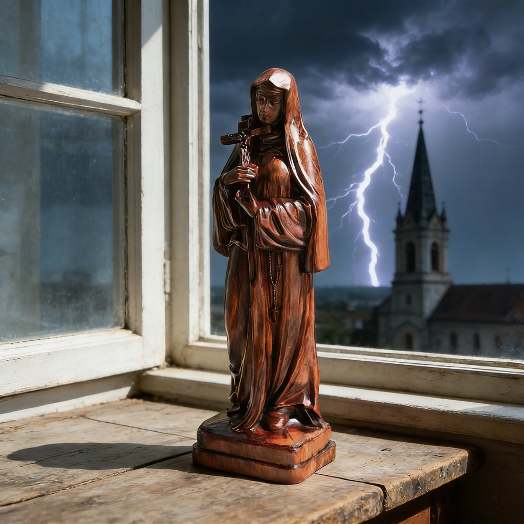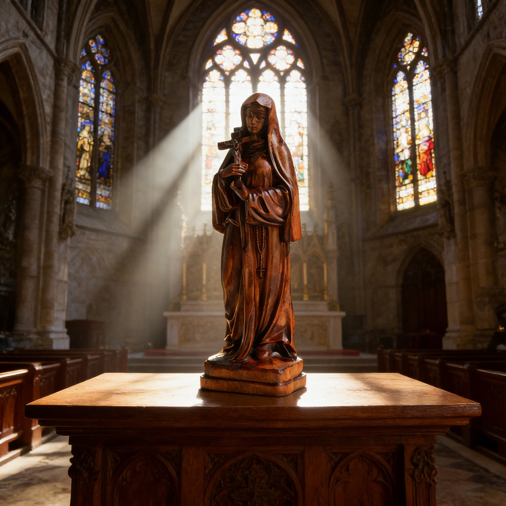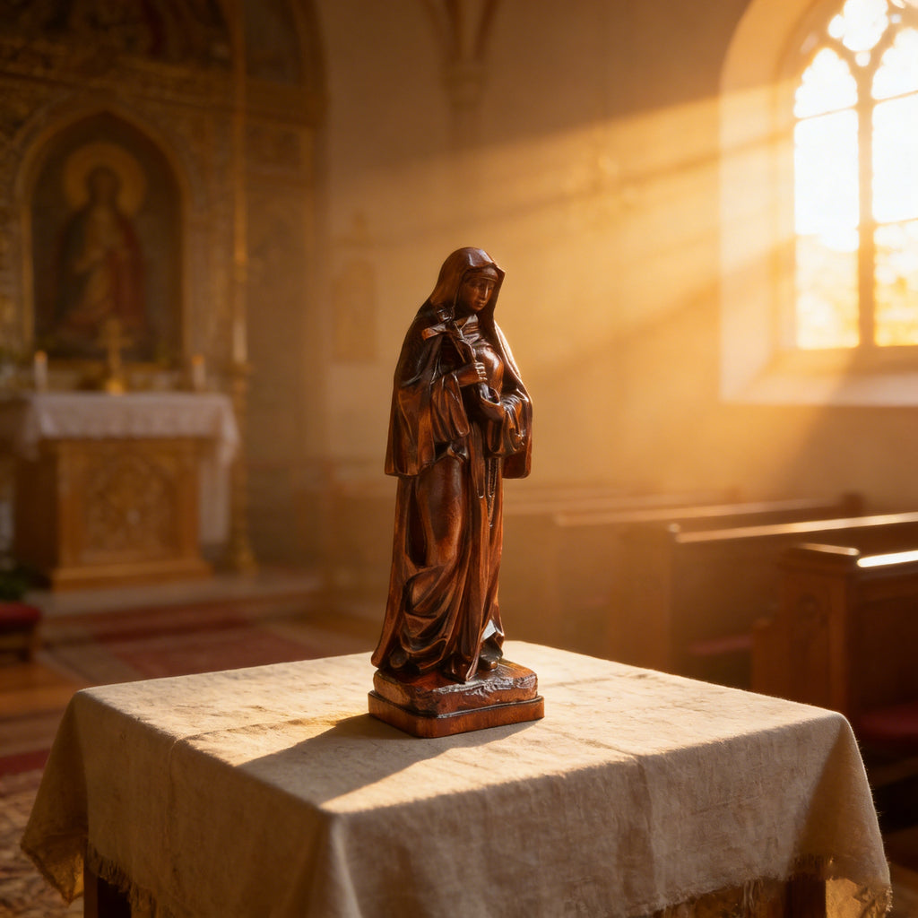 Crafted from selected wood, this sculpture meticulously depicts Saint Teresa of Avila. Her robe flows gracefully, headscarf softens her brow, and her tranquil expression embodies peace. Holding a cross, with a rosary hanging by her side, every fold of her garment is vividly carved. Each detail—from her serene facial features to the delicate lines of her attire—faithfully restores her sacred aura, merging artistry with faith to emanate silent solemnity.