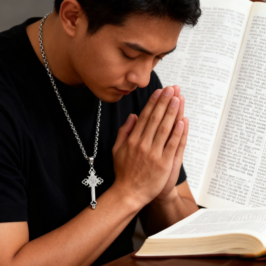 Saying these prayers daily deepens your connection to the sacramental’s spiritual purpose. Person holding medal in prayer
