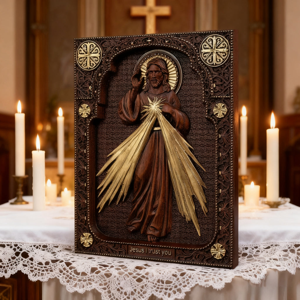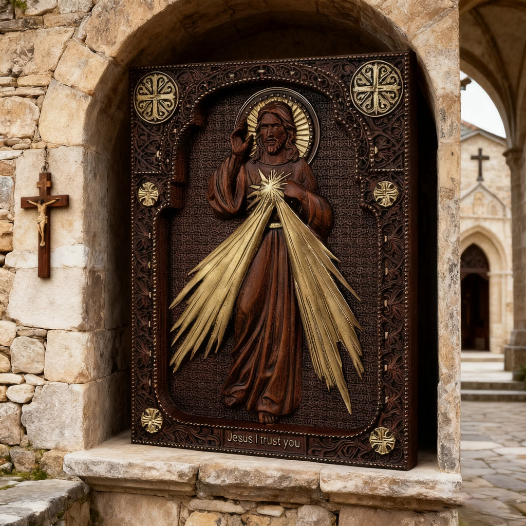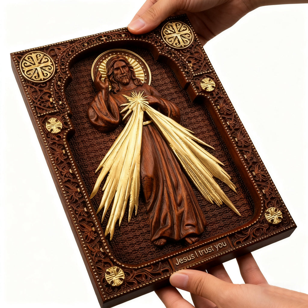 Our artisans pour heartfelt dedication into carving every detail — from the radiant Sacred Heart of Jesus, to the faithful proclamation "Jesus, I trust in You," and the delicate religious motifs along the edges. Each element is brought to life, transforming Christ's mercy and call into a tangible expression of faith.