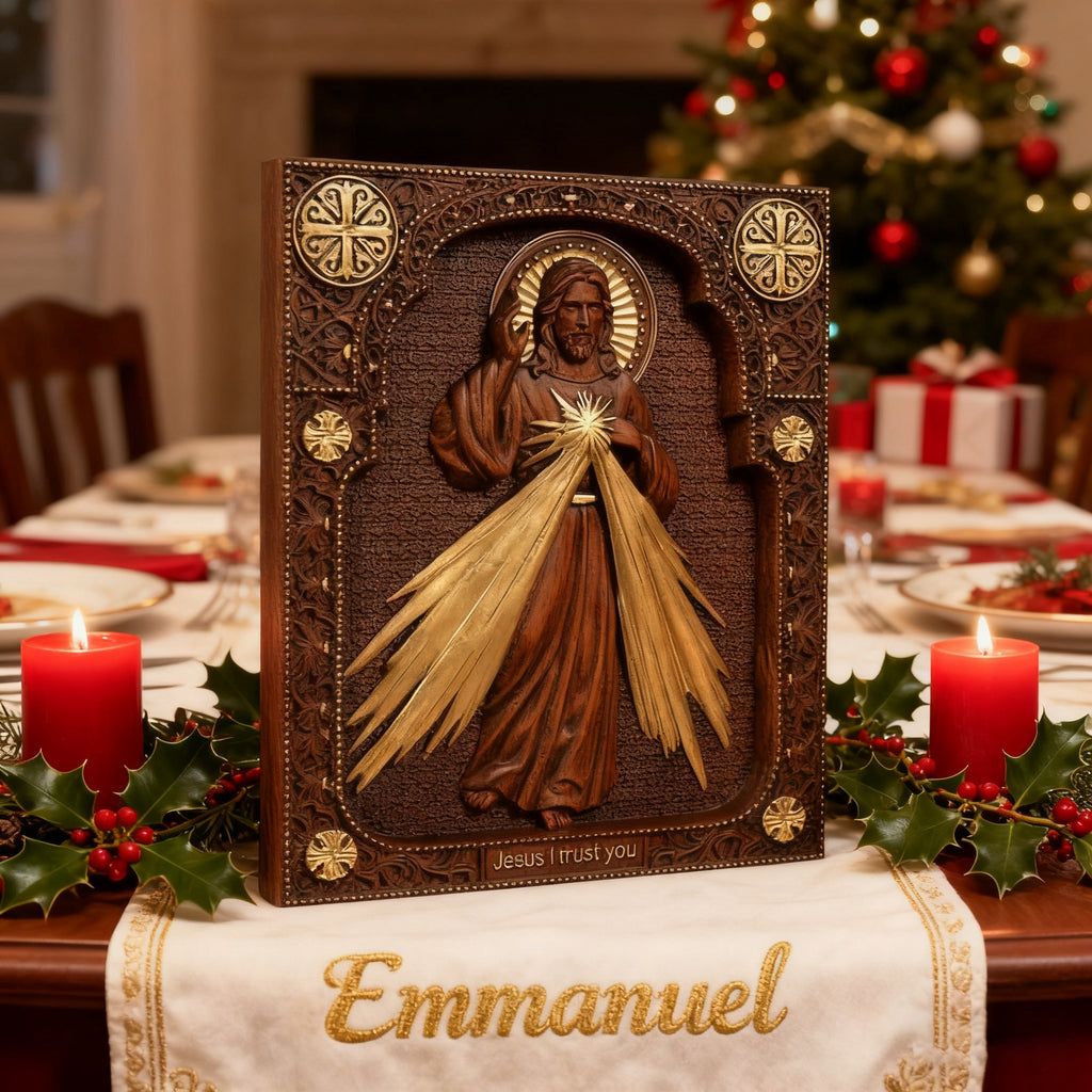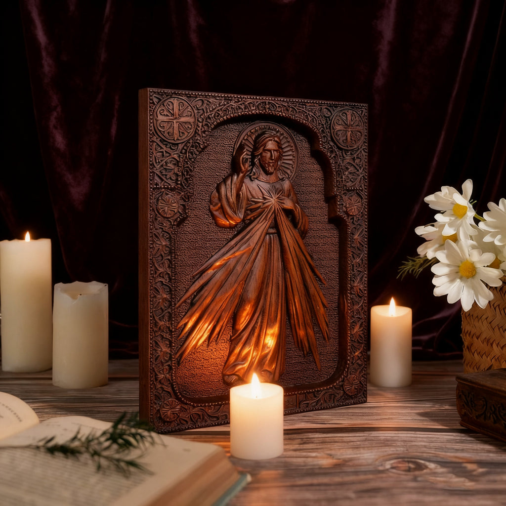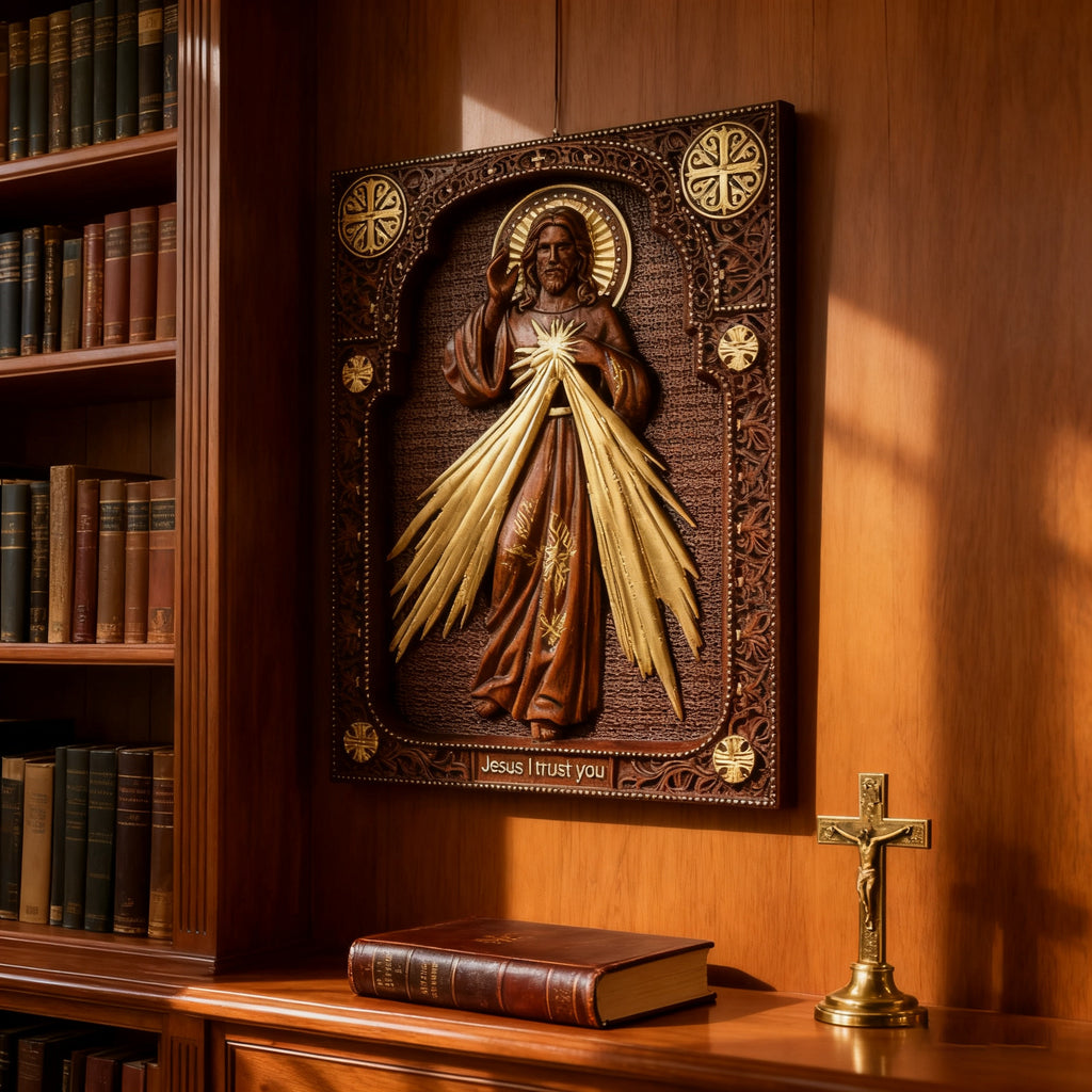Our artisans pour heartfelt dedication into carving every detail — from the radiant Sacred Heart of Jesus, to the faithful proclamation "Jesus, I trust in You," and the delicate religious motifs along the edges. Each element is brought to life, transforming Christ's mercy and call into a tangible expression of faith.