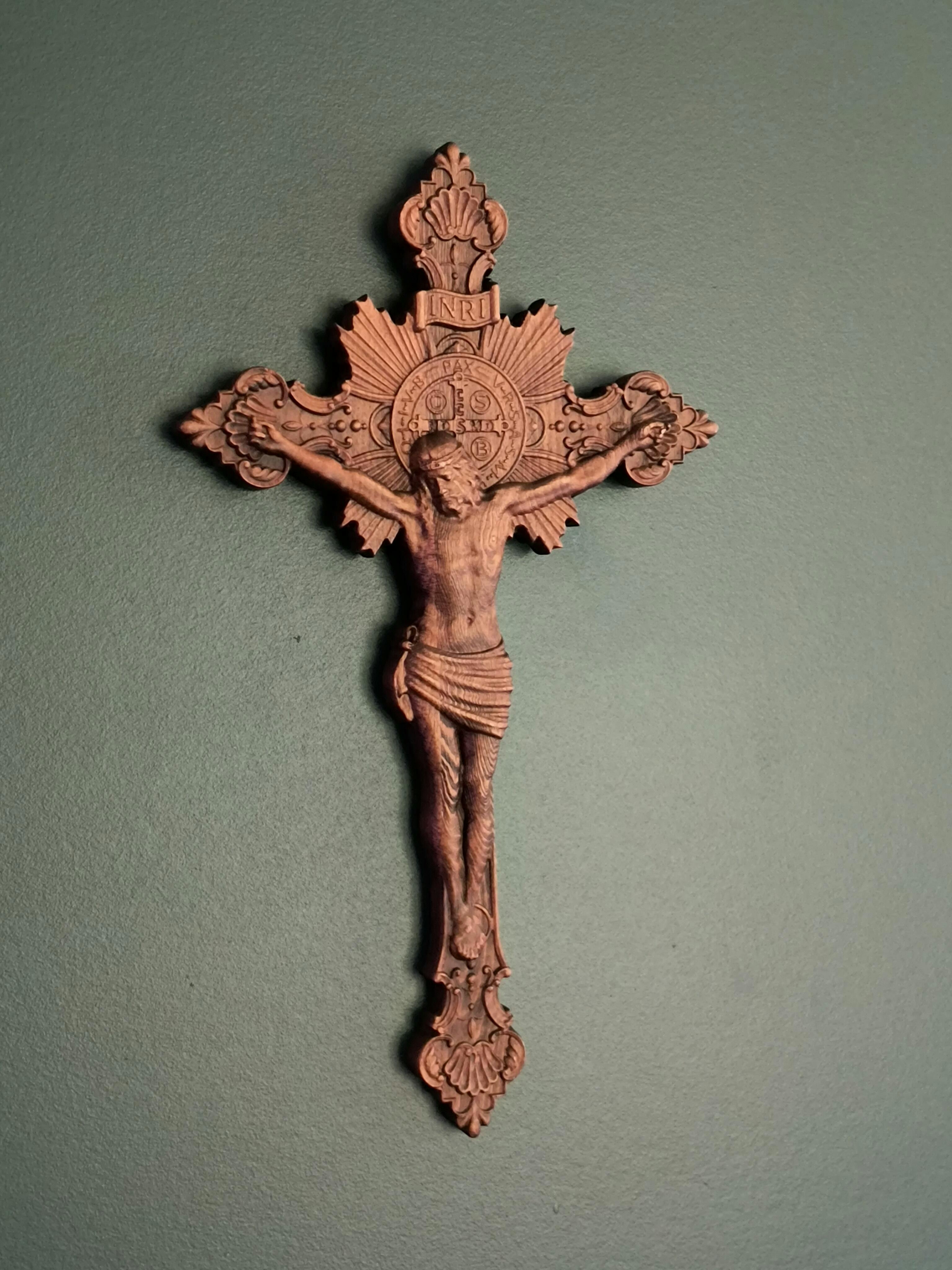 Wood Carving of Jesus Cross with St. Benedict's Exorcism
