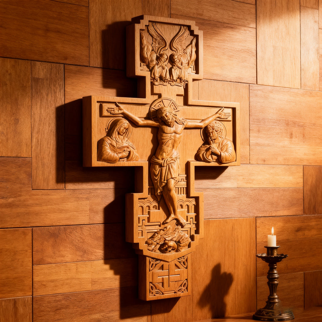 • Craftsmanship: Fully hand-carved, artisans shape every detail with a pious heart—the solemnity of Jesus' crucifixion, the compassion of the Virgin Mary, the contemplation of St. John, and the sacred posture of the angel at the top, all vividly rendered to give tangible form to the power of faith within the wood's grain.